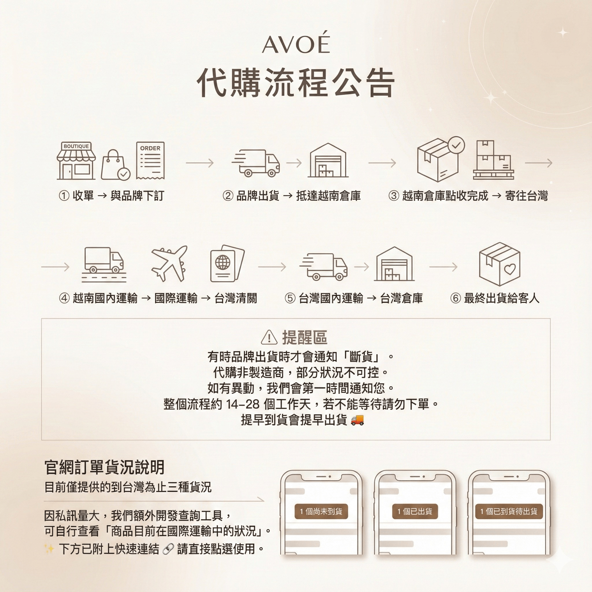 - 本賣場商品皆為 預購 14–28 個工作天(不含假日)。若提早到貨都會立即寄出 🤍。不接急單。