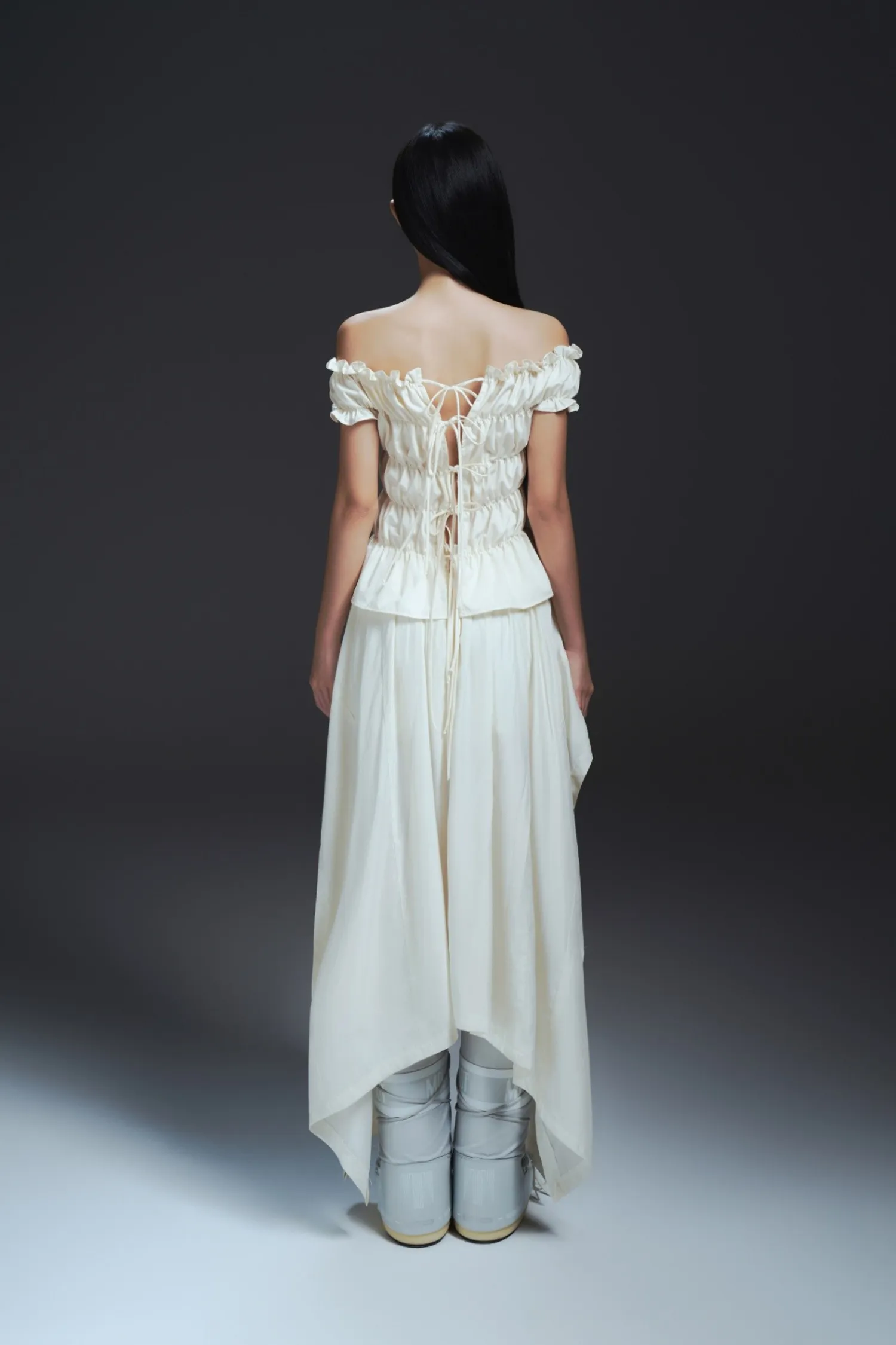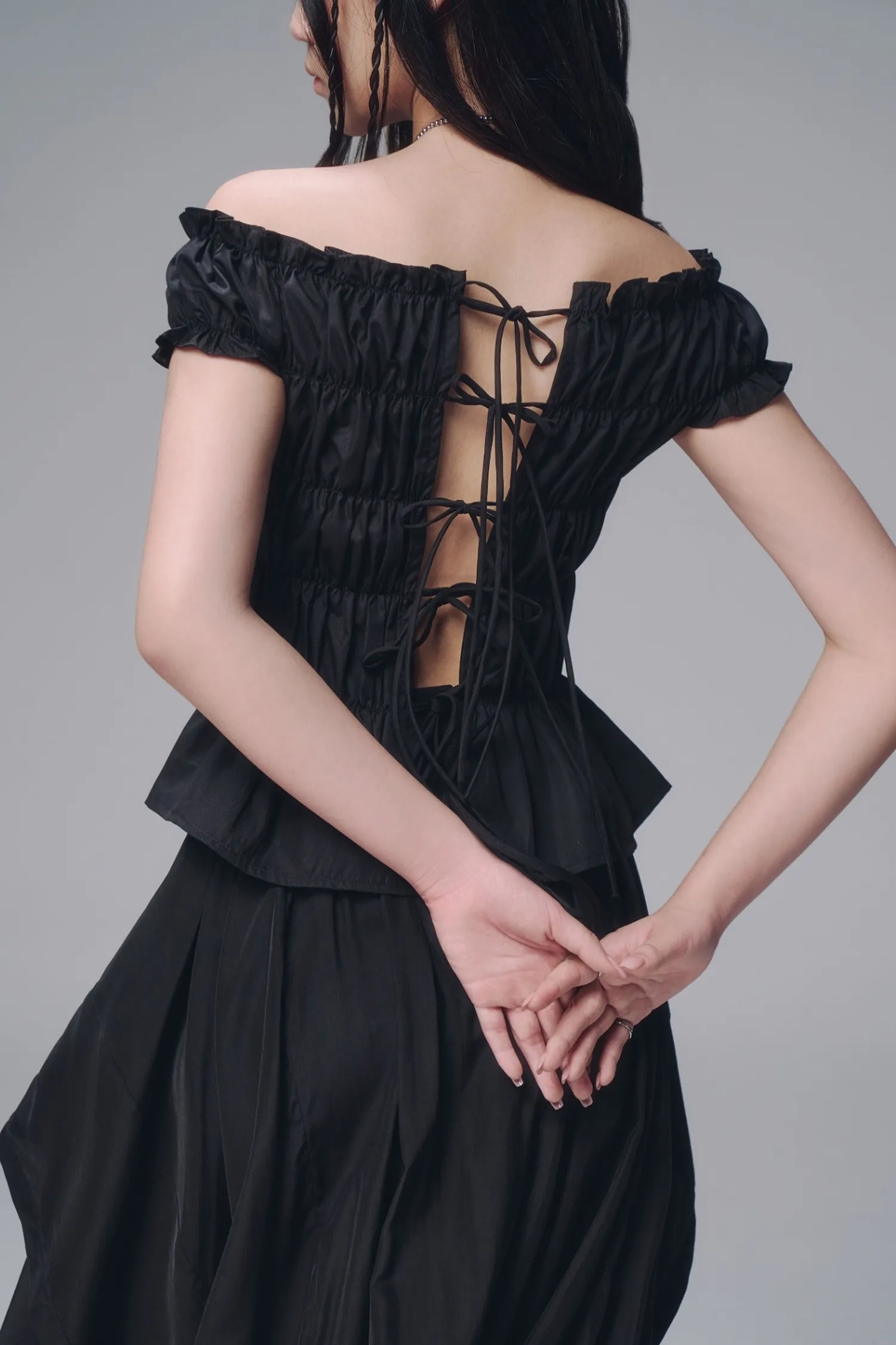 繞頸上衣,背部鏤空設計,兩側蝴蝶結裝飾,背後附帶綁帶