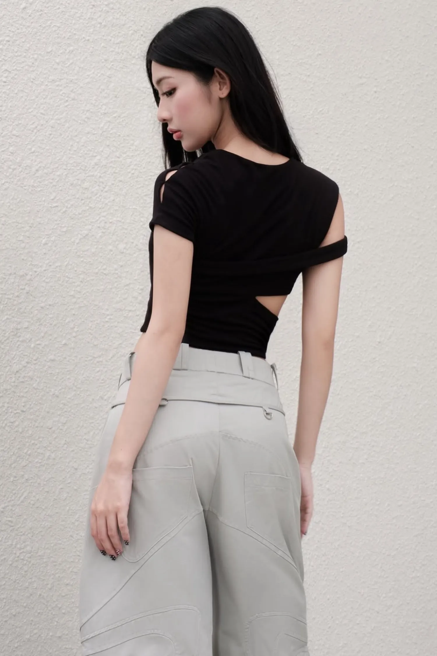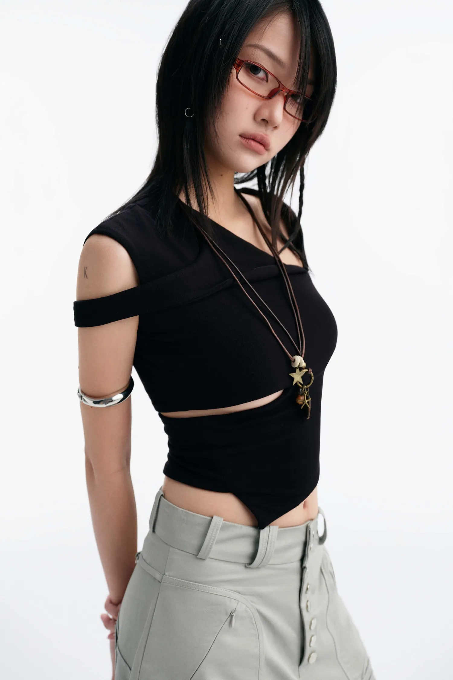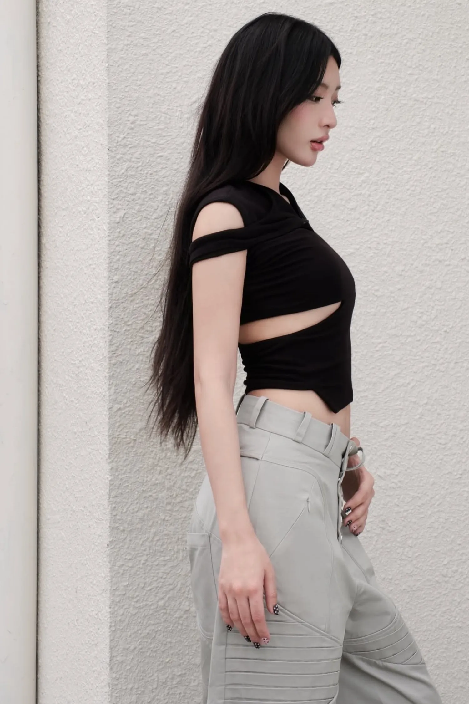 彈性鏤空上衣,領口飾有水滴形拉鍊
