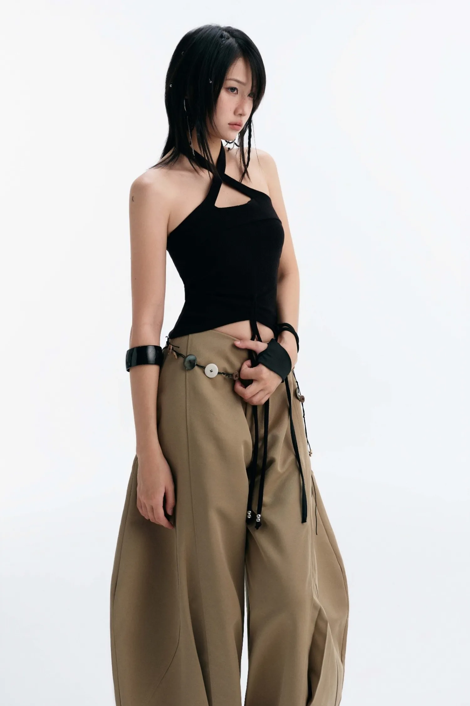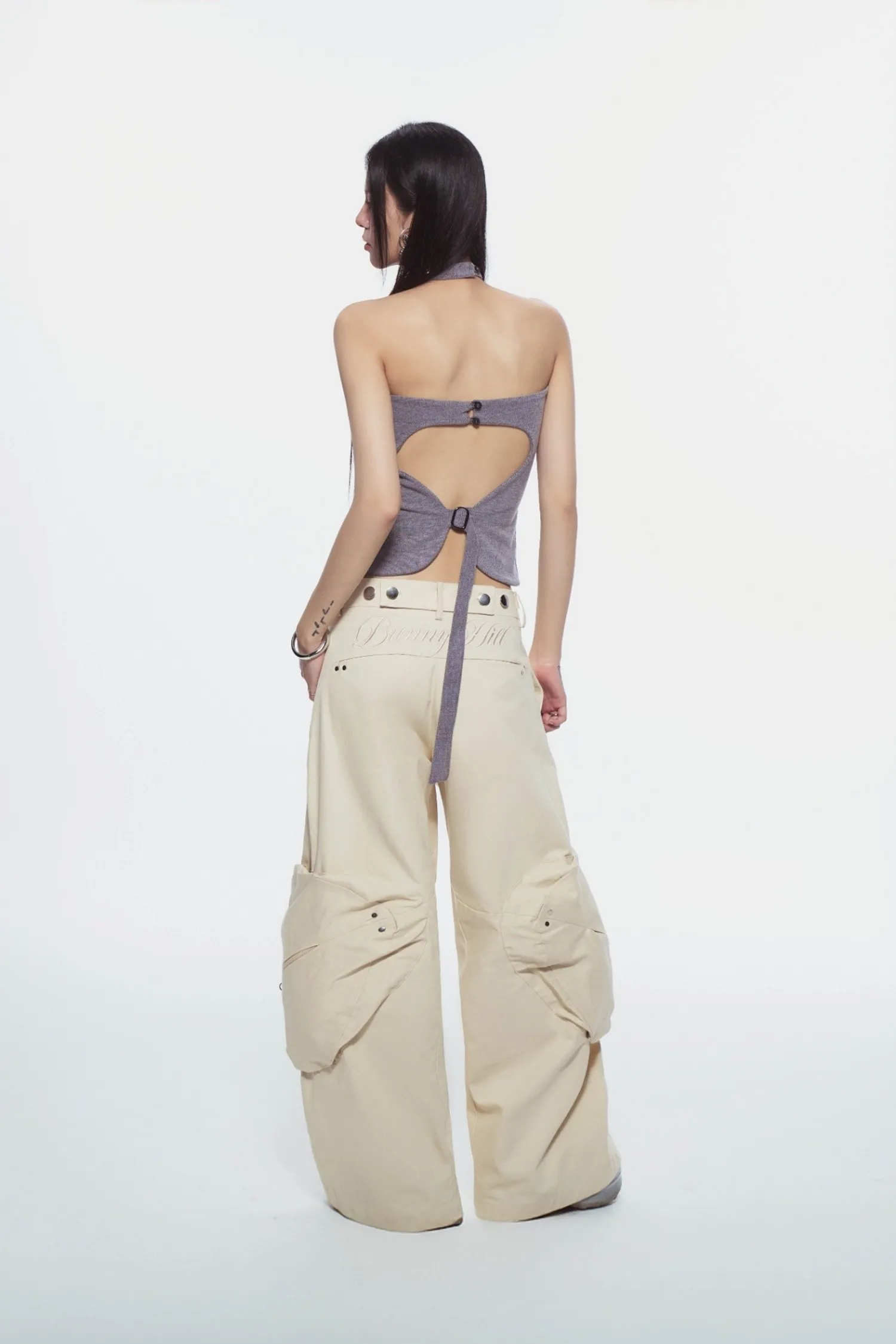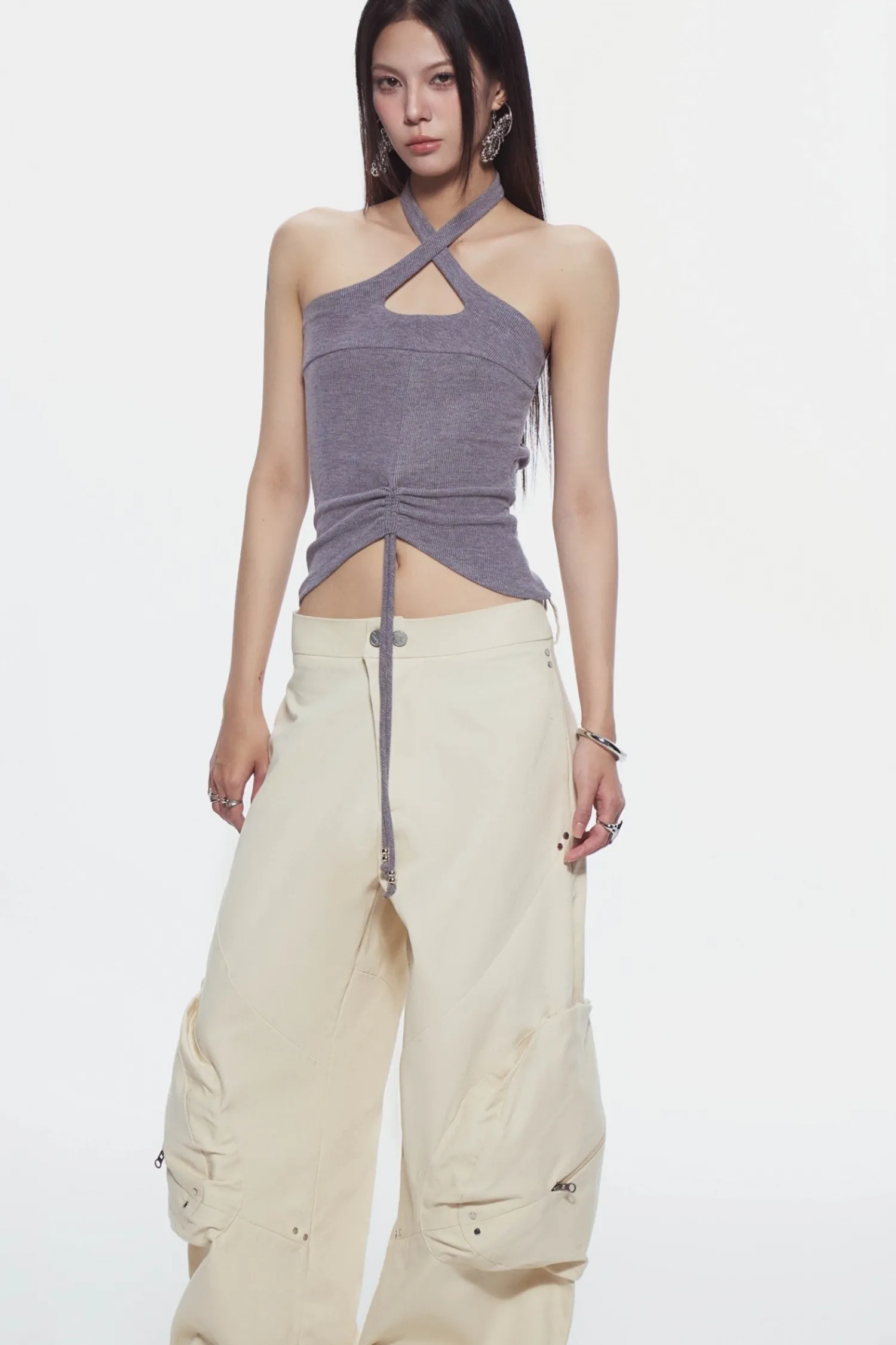 交叉繞頸背心,後背鏤空設計,背部附有可調節肩帶