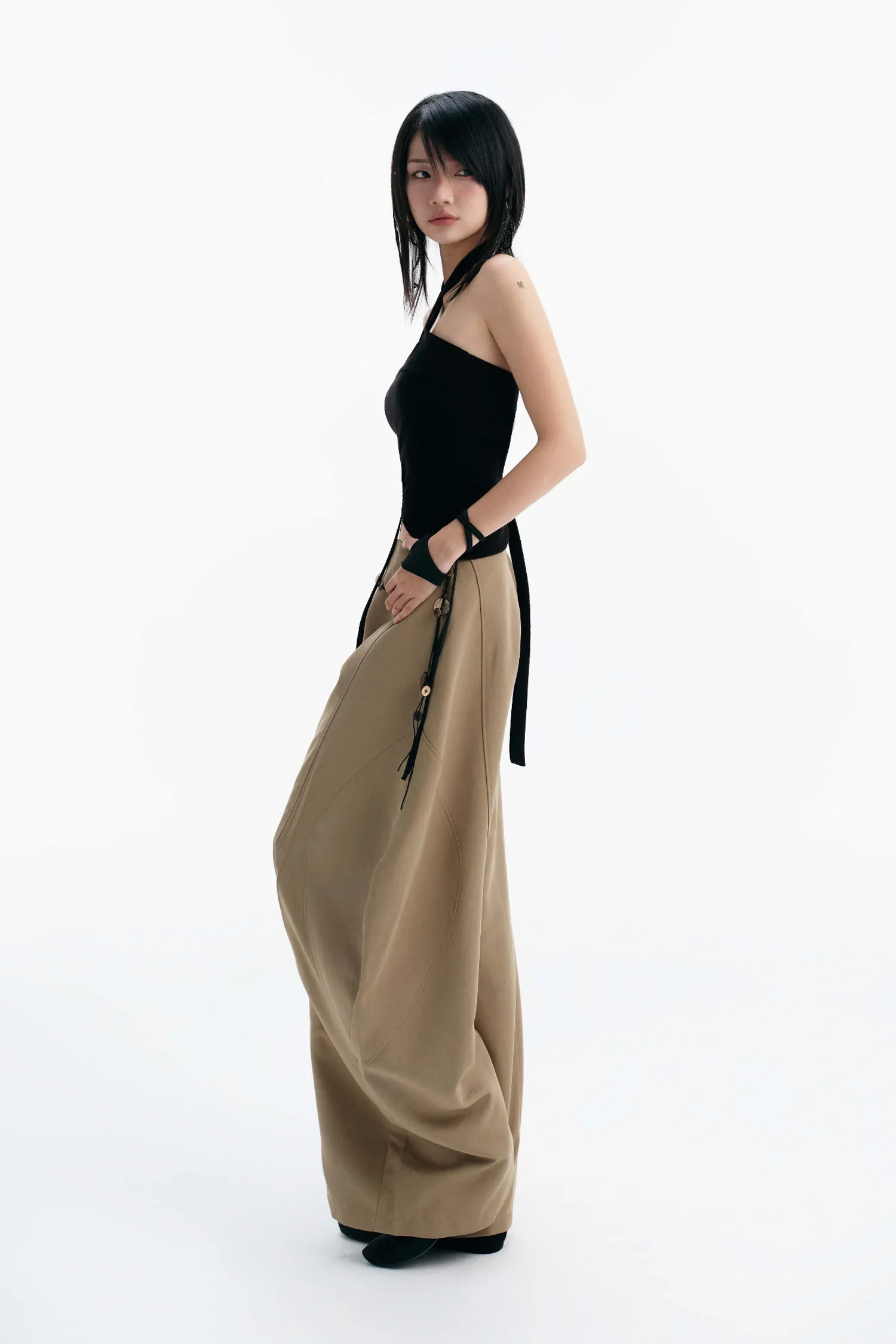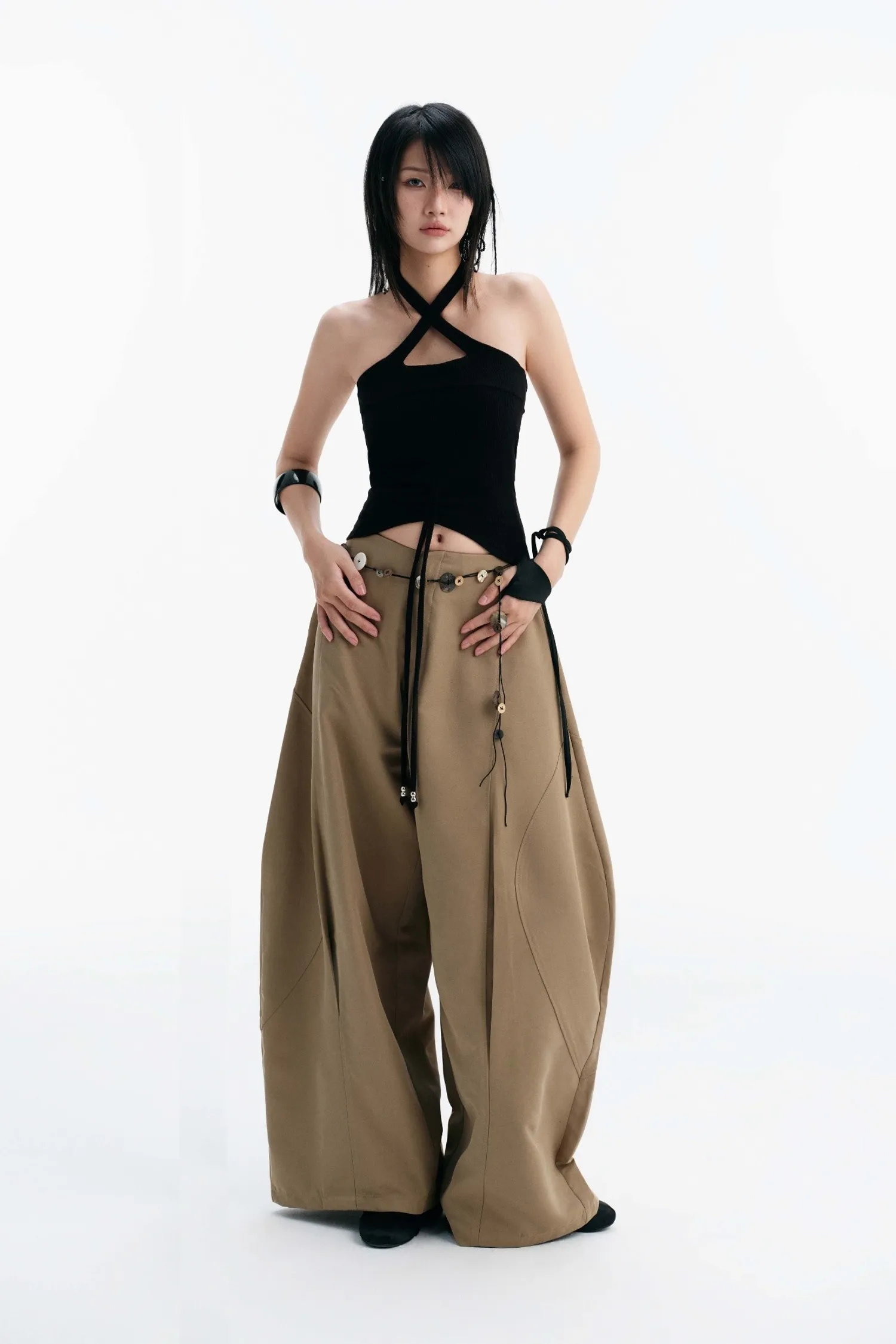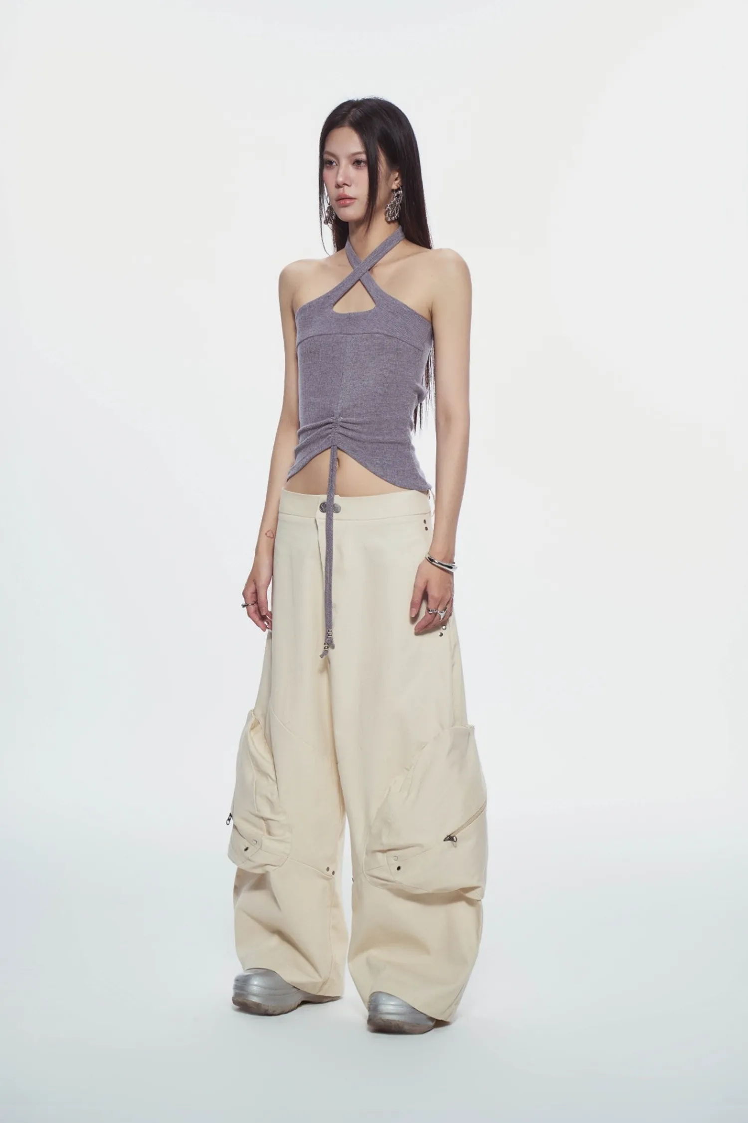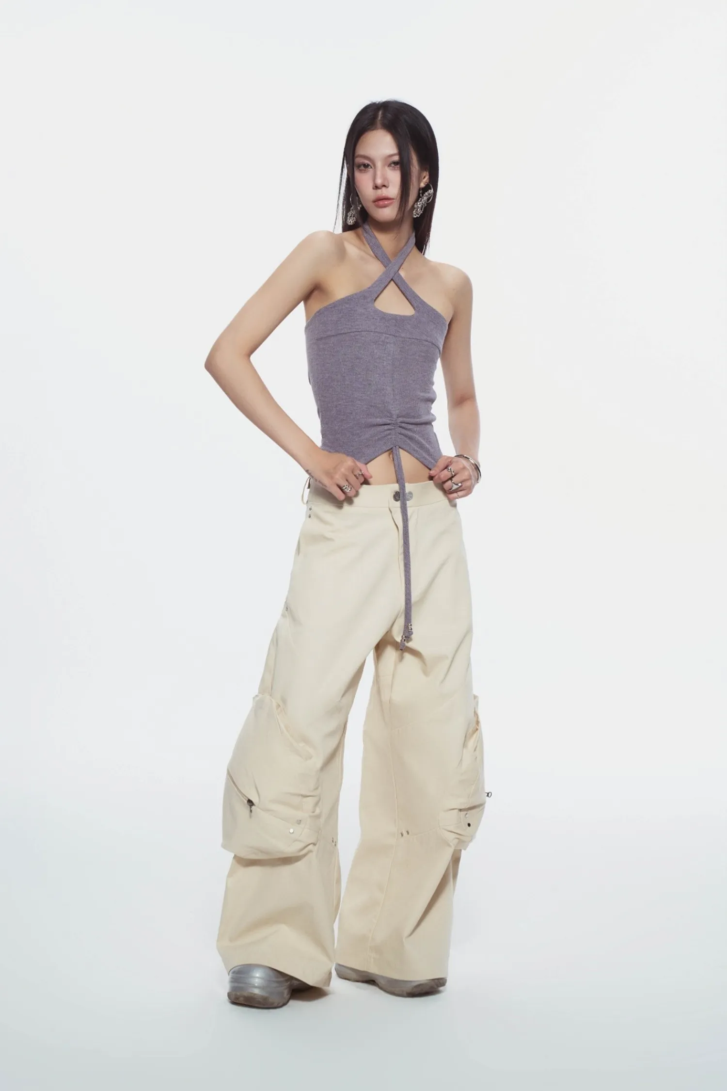 交叉繞頸背心,後背鏤空設計,背部附有可調節肩帶