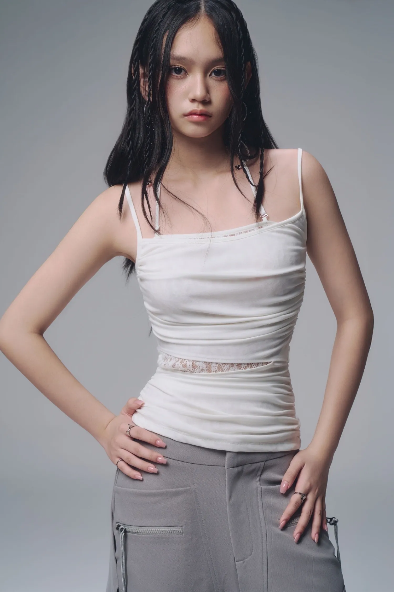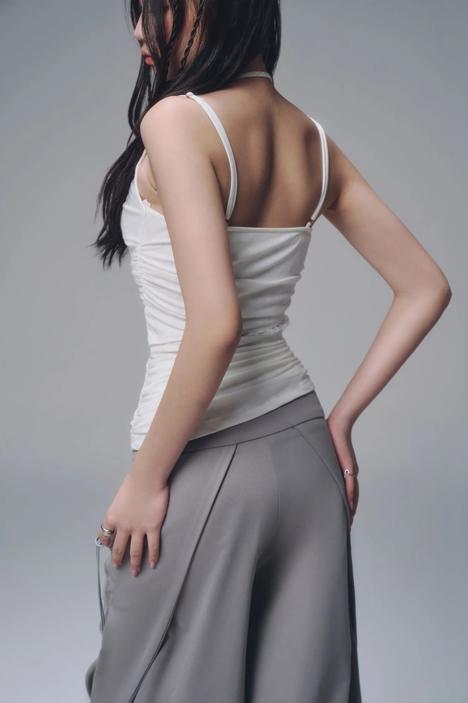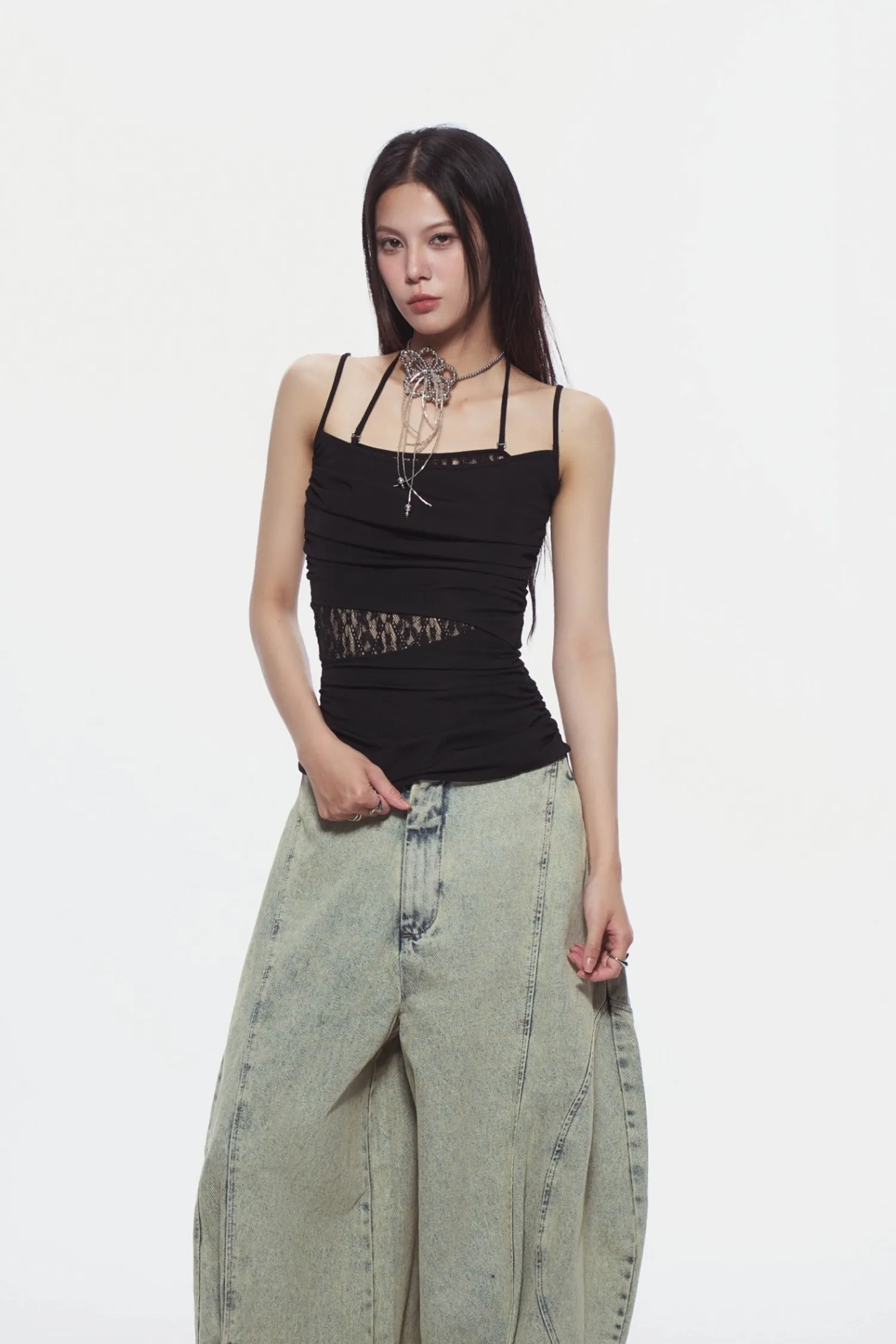 修身吊帶上衣,腰部兩側帶有褶皺細節,內層拼接蕾絲襯裡