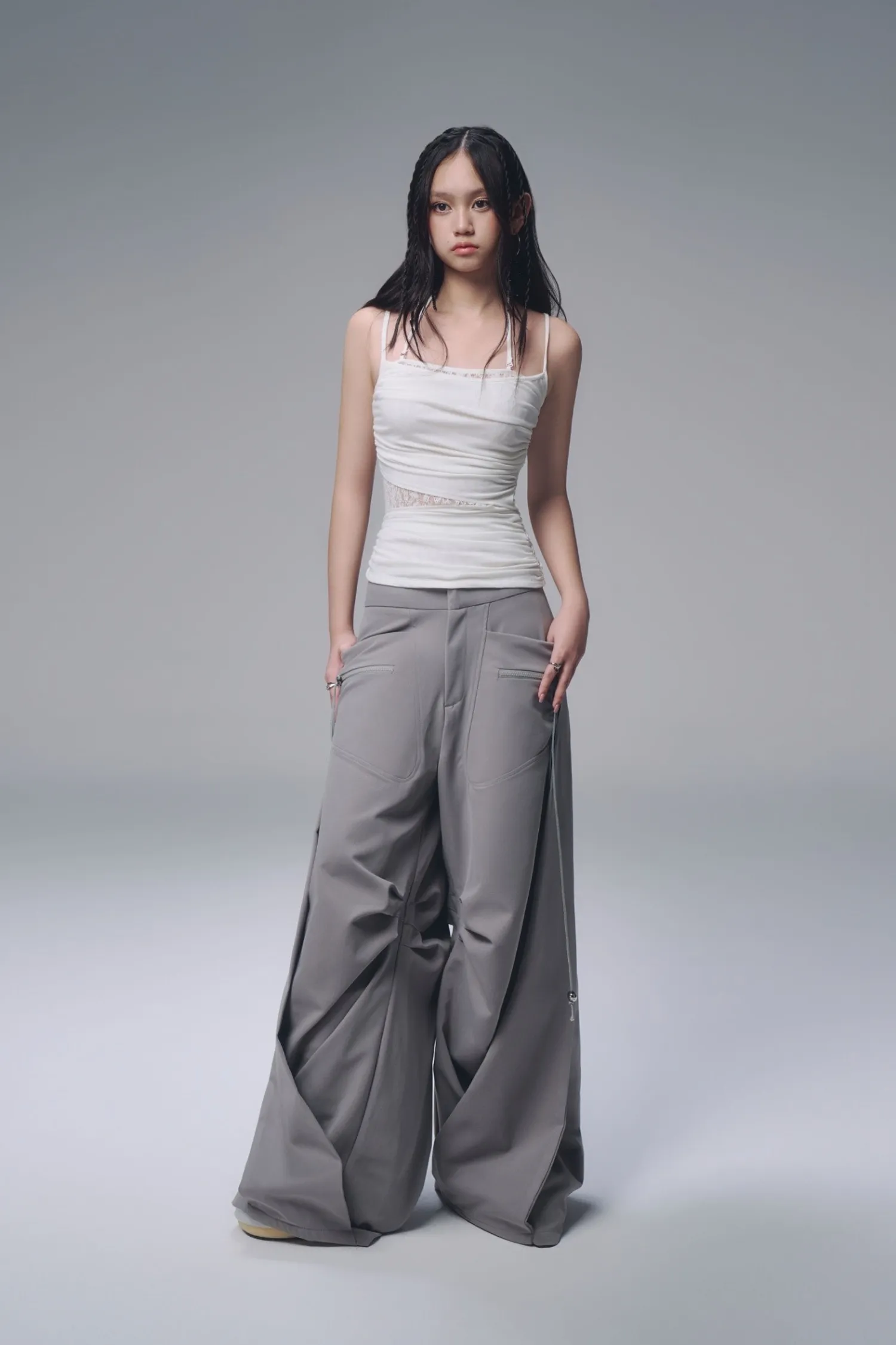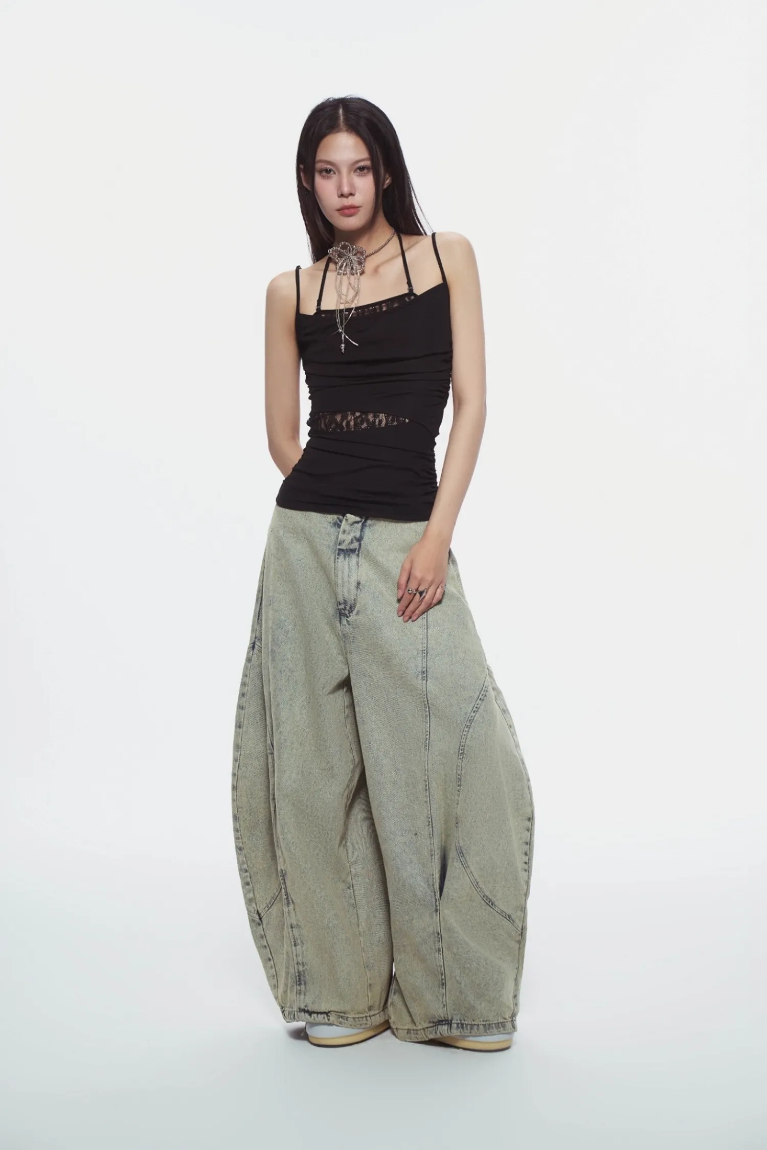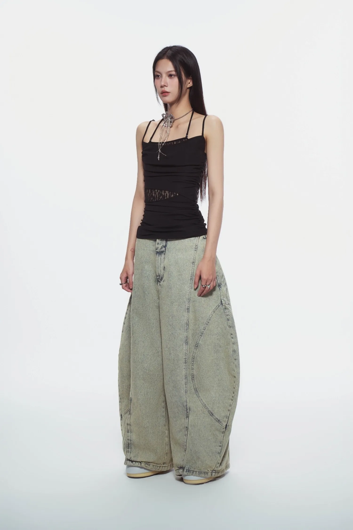 修身吊帶上衣,腰部兩側帶有褶皺細節,內層拼接蕾絲襯裡