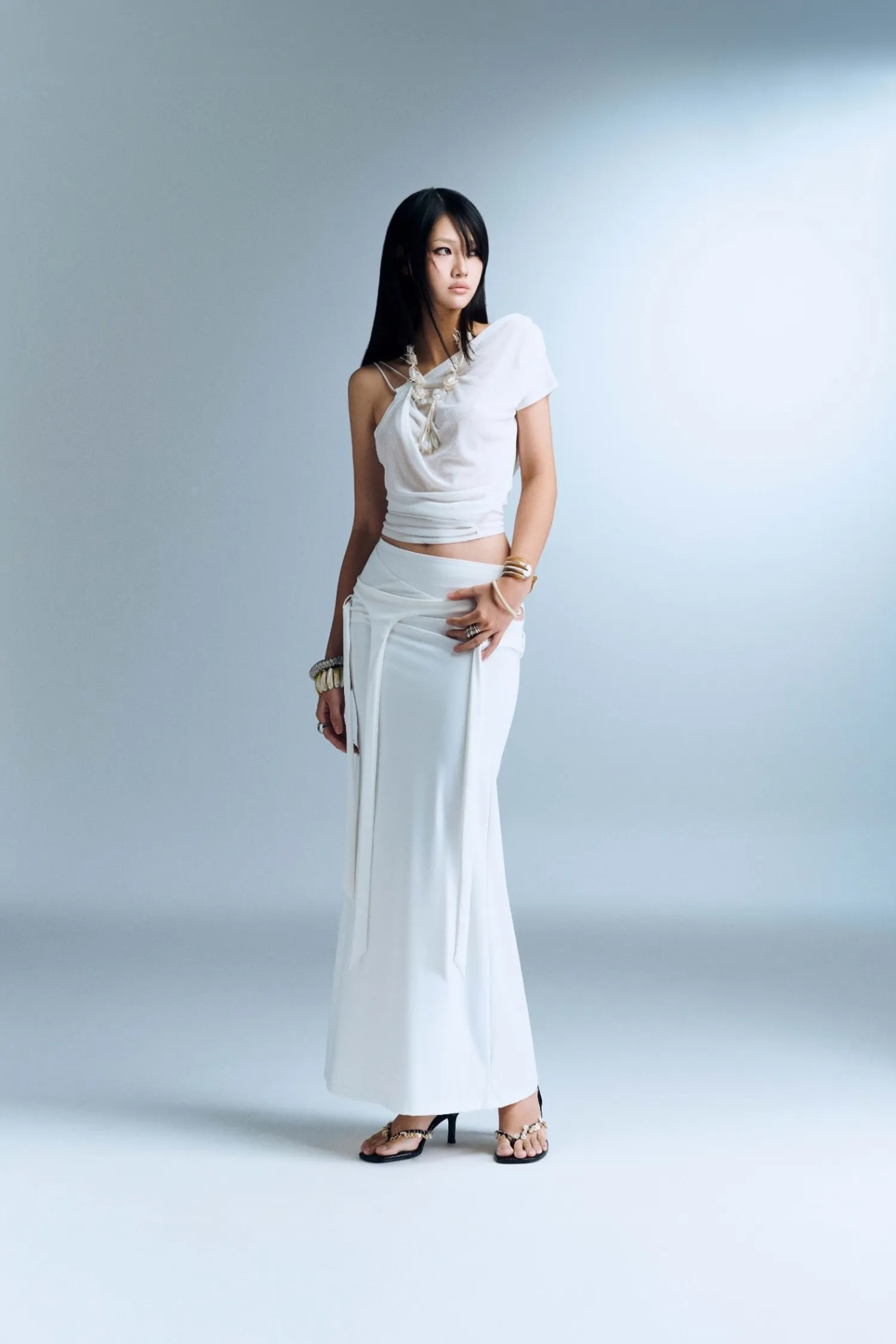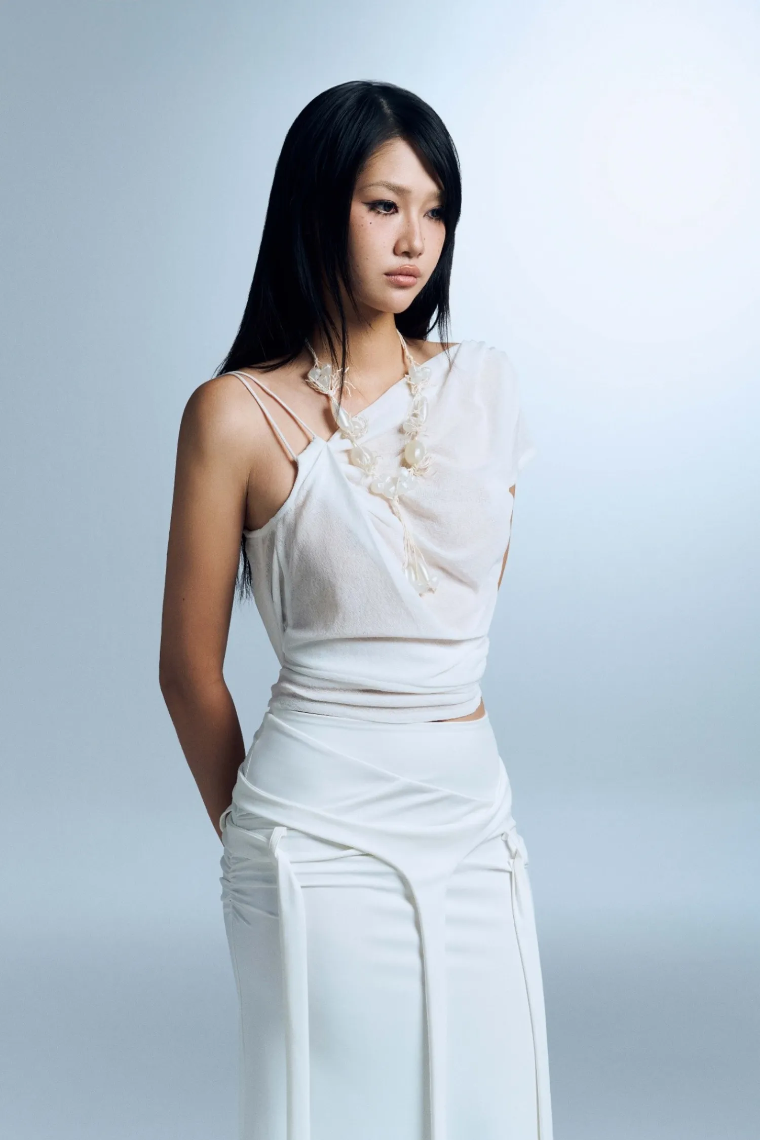 褶皺露背上衣,搭配標誌裝飾肩帶