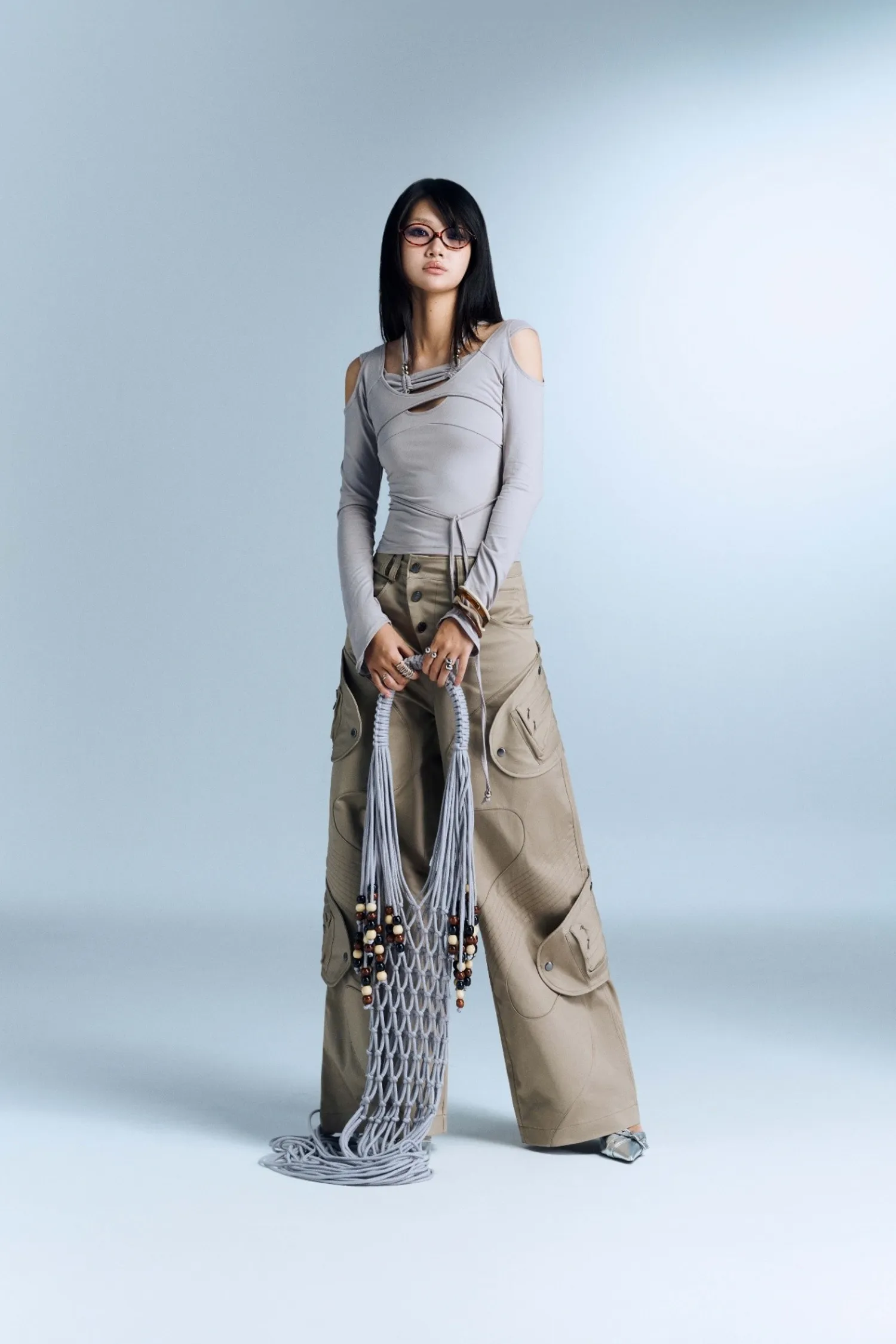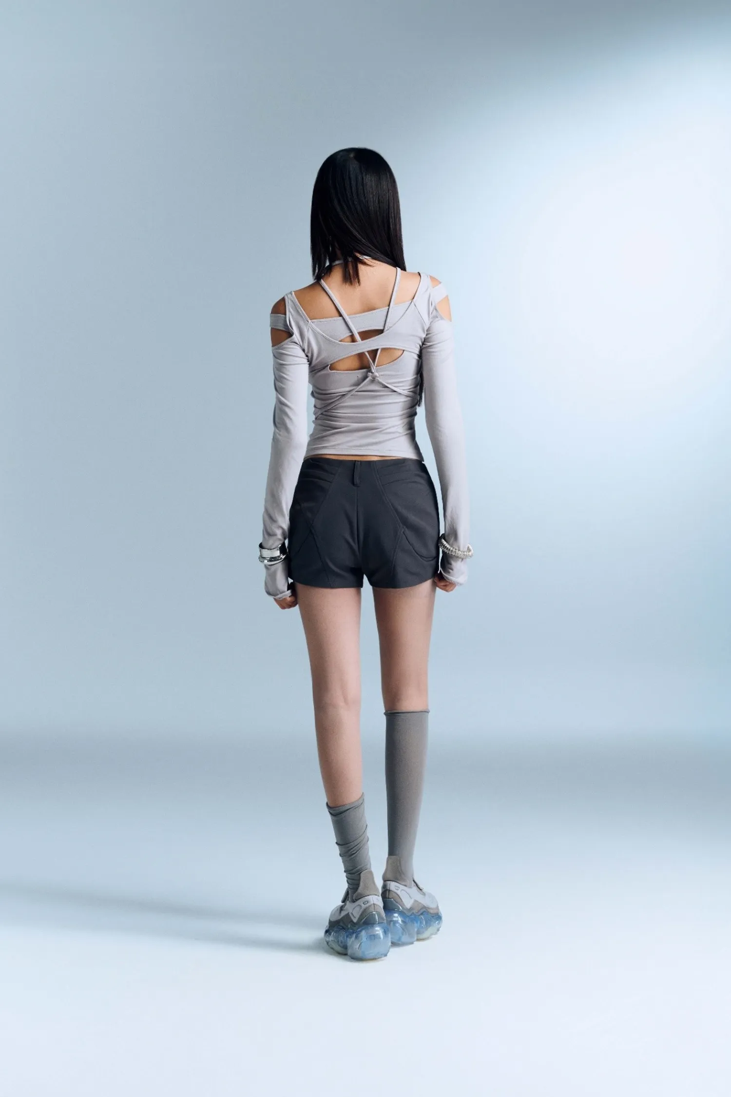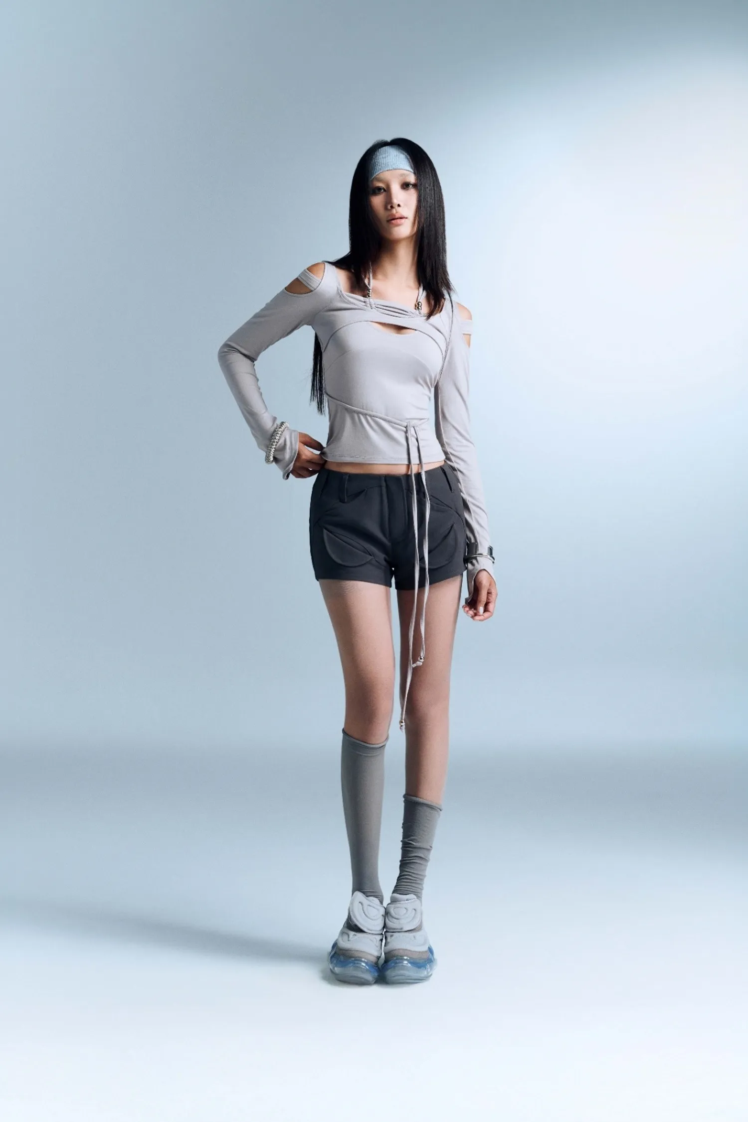 長袖上衣,肩膀有鏤空設計,並配有裝飾性抽繩