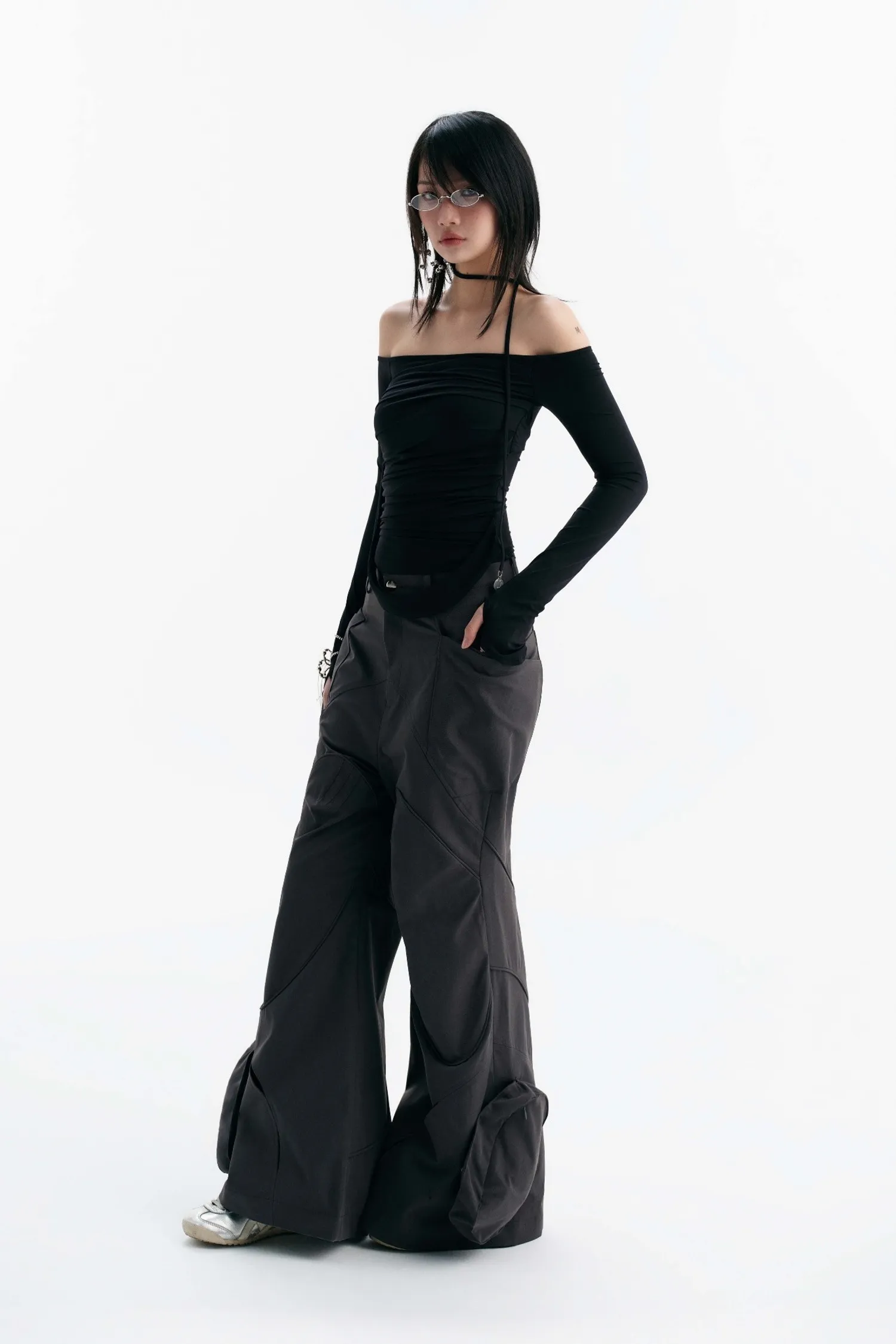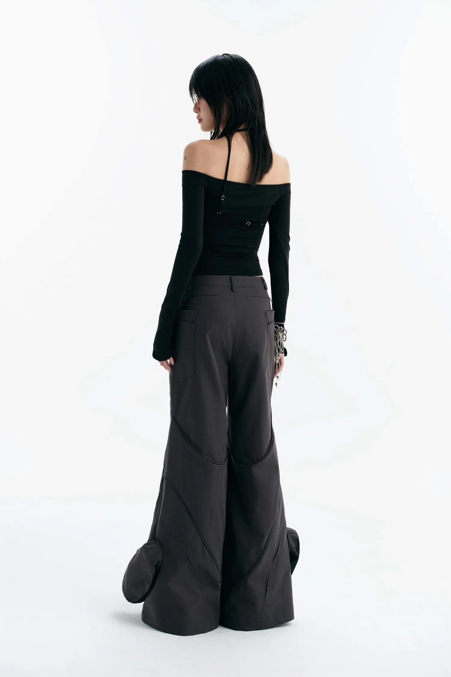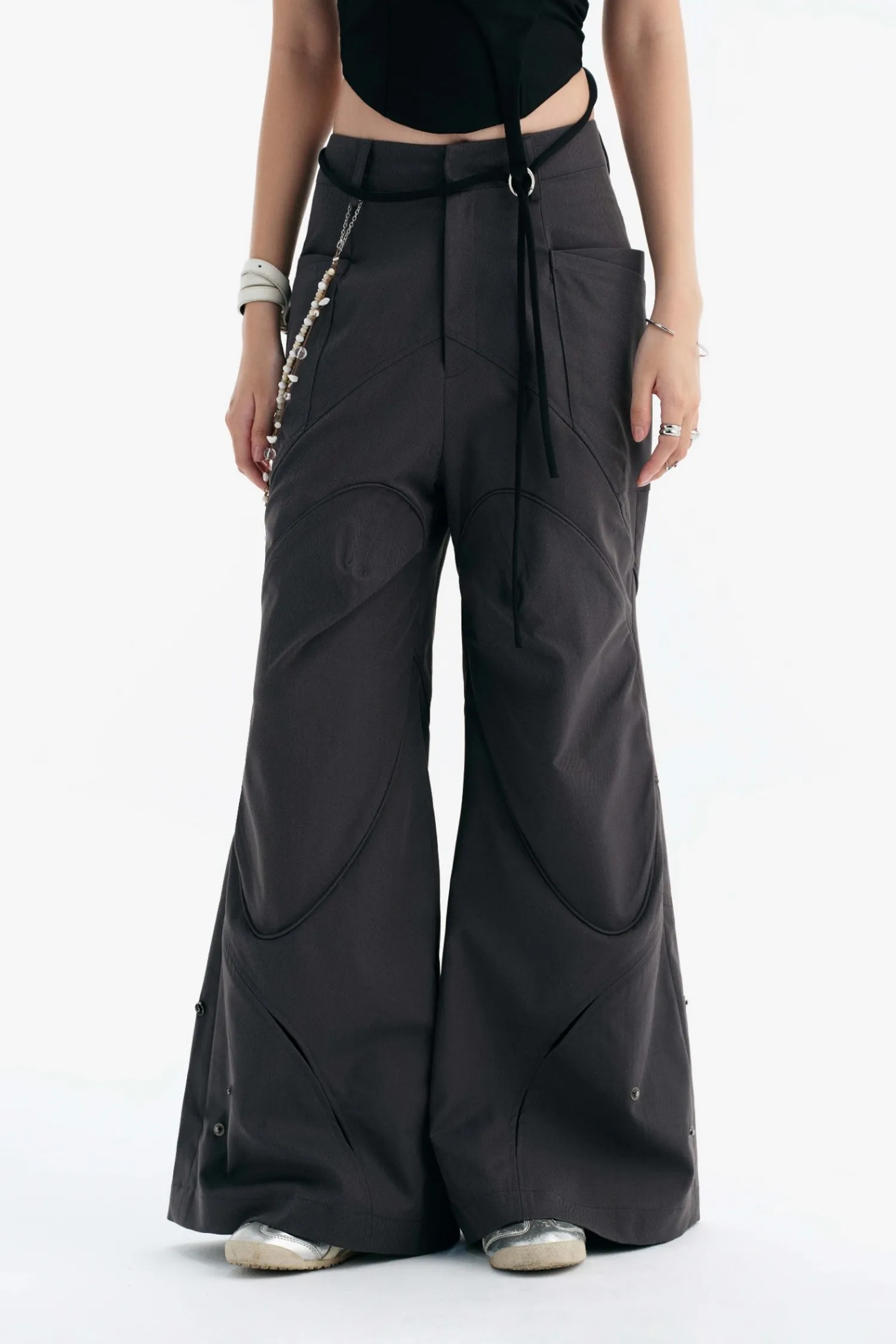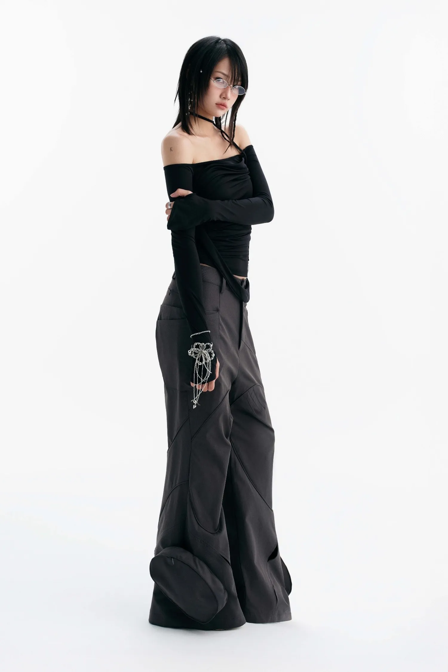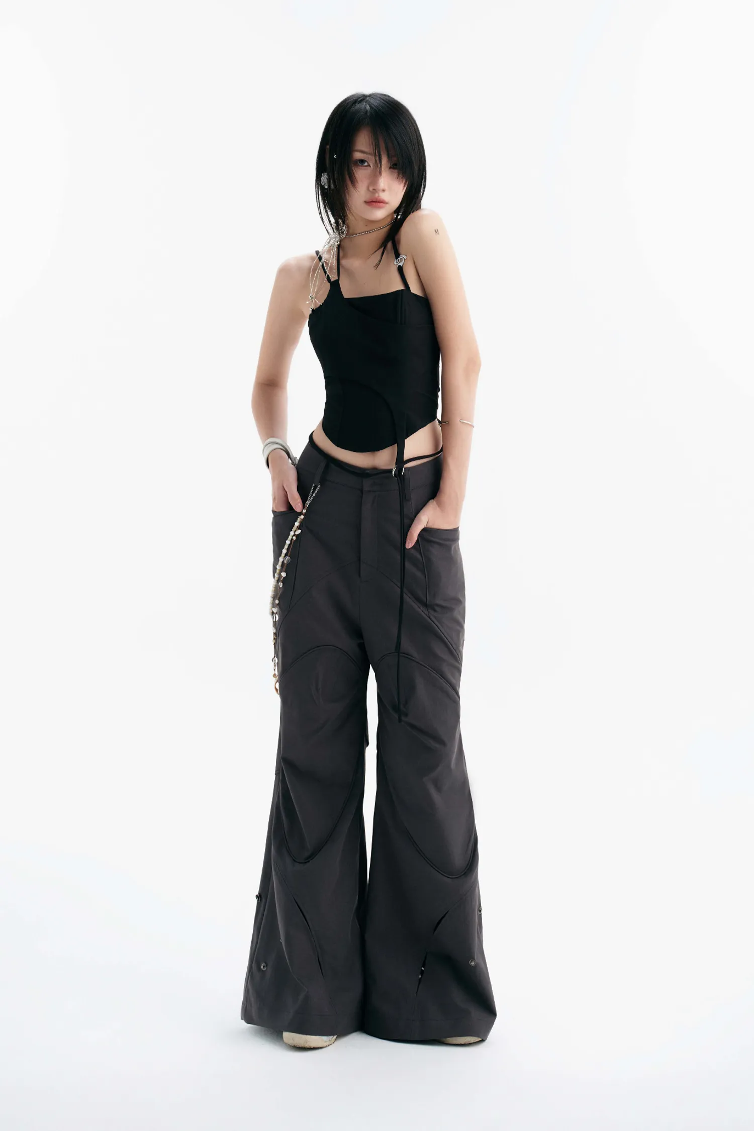 喇叭褲,下擺有鏤空設計,配有兩個可拆卸的工裝口袋