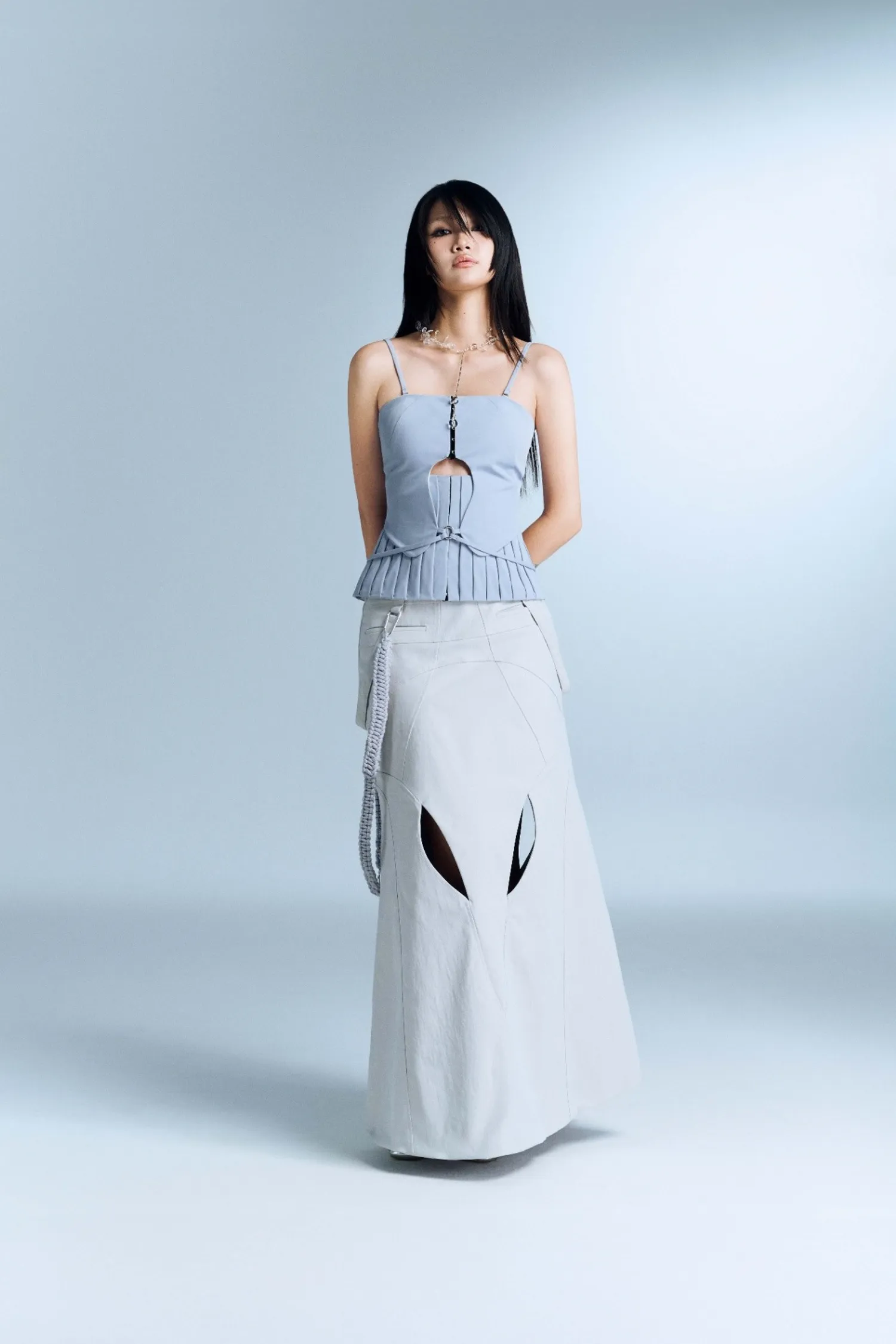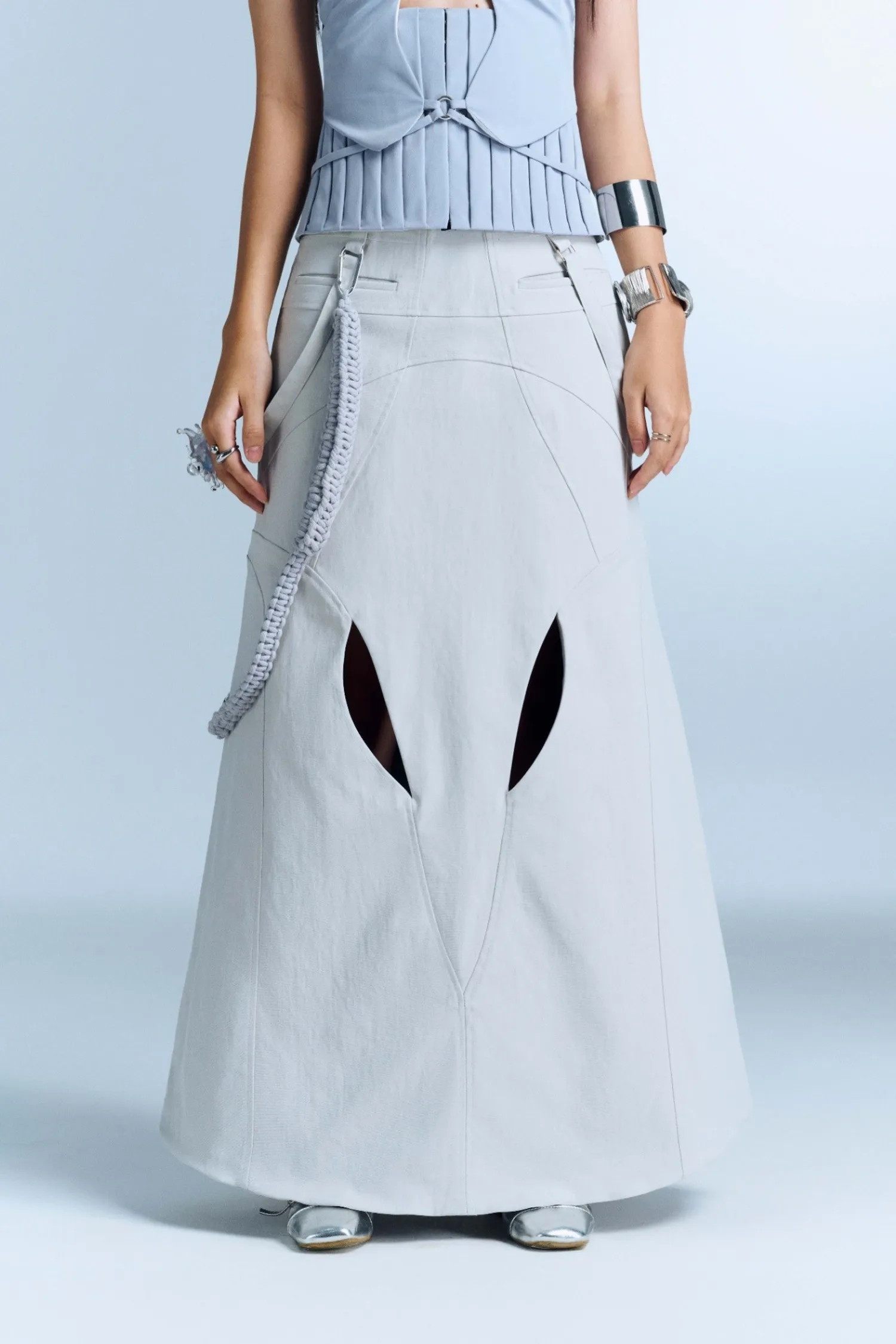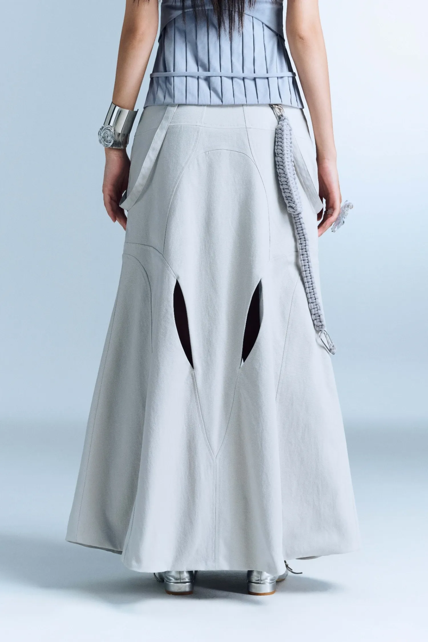 長 A 字裙,前後有鏤空細節