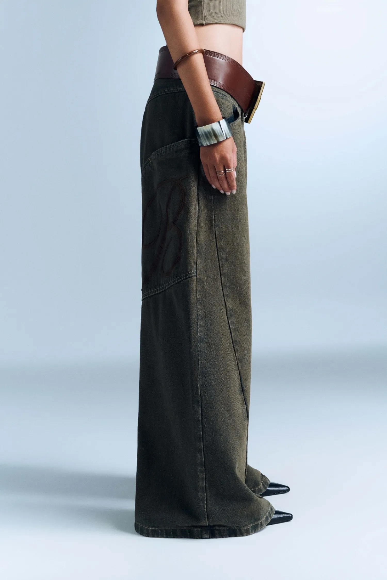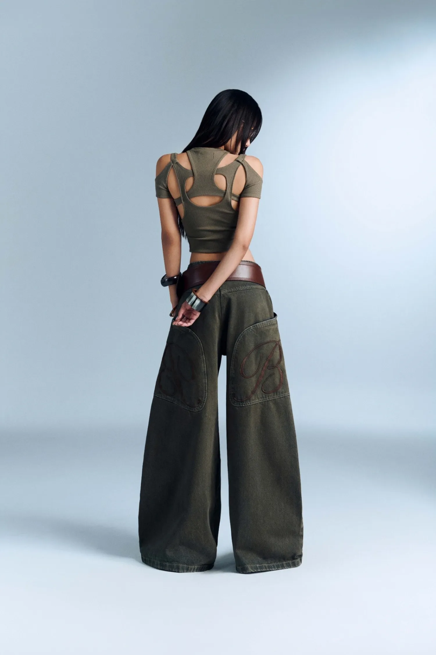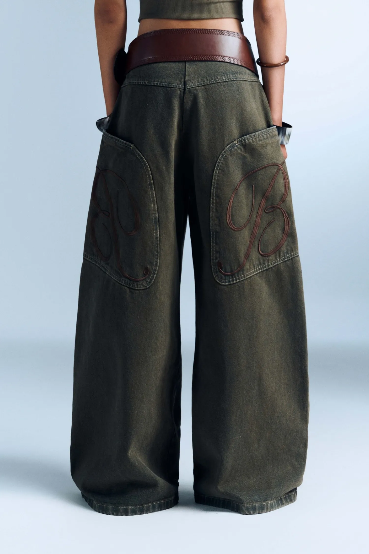 直筒褲,附有大貼袋,後背有棕色刺繡字母