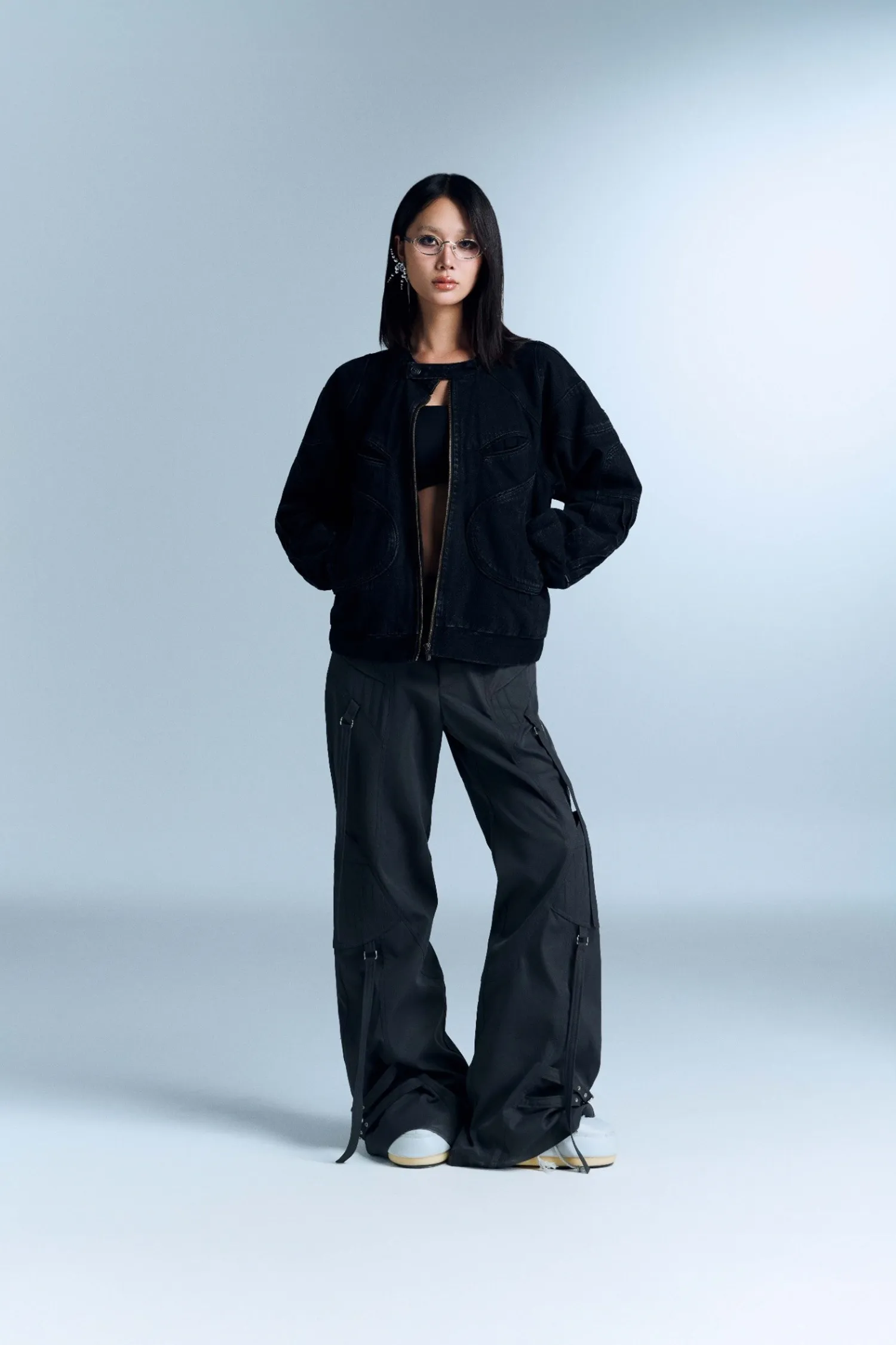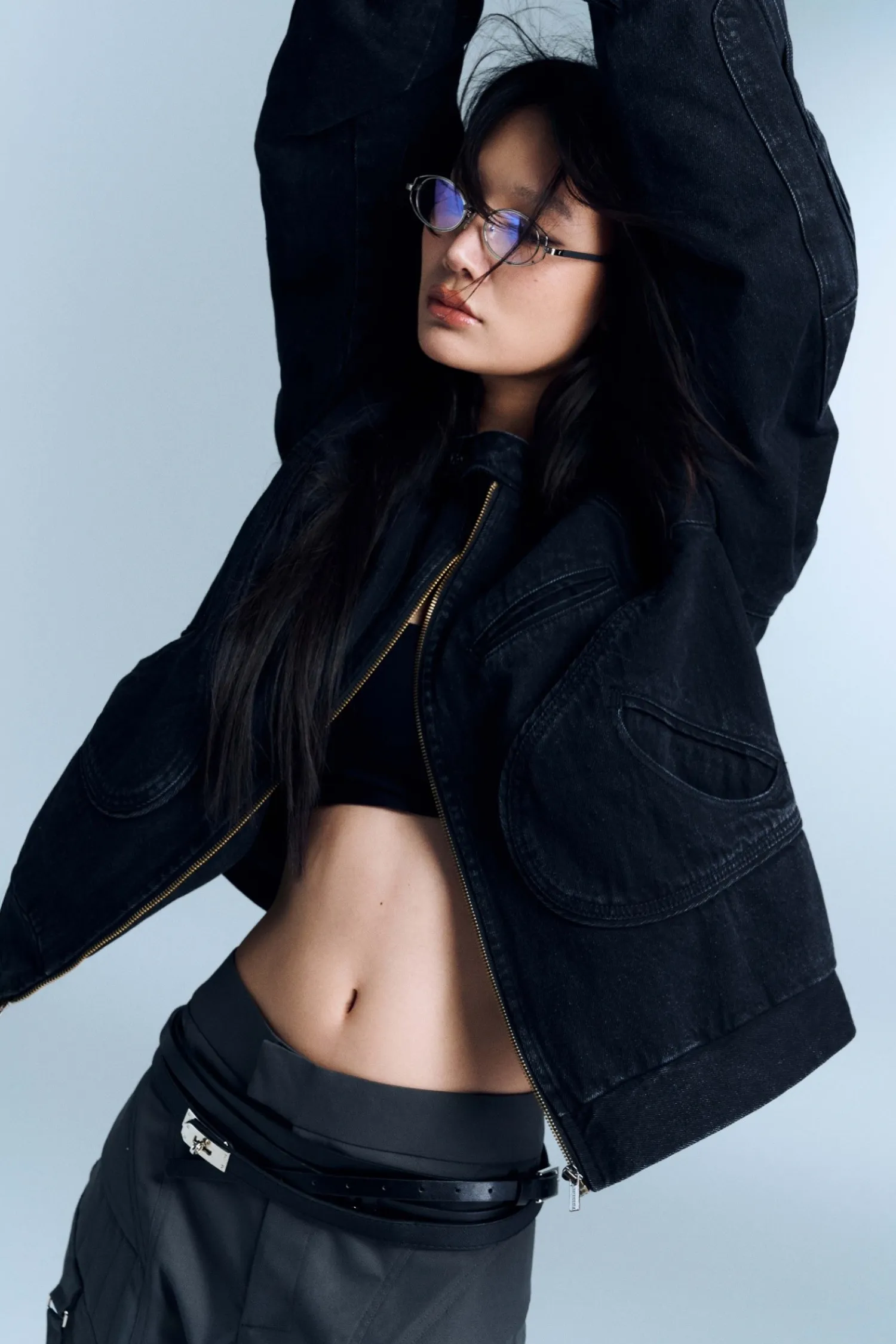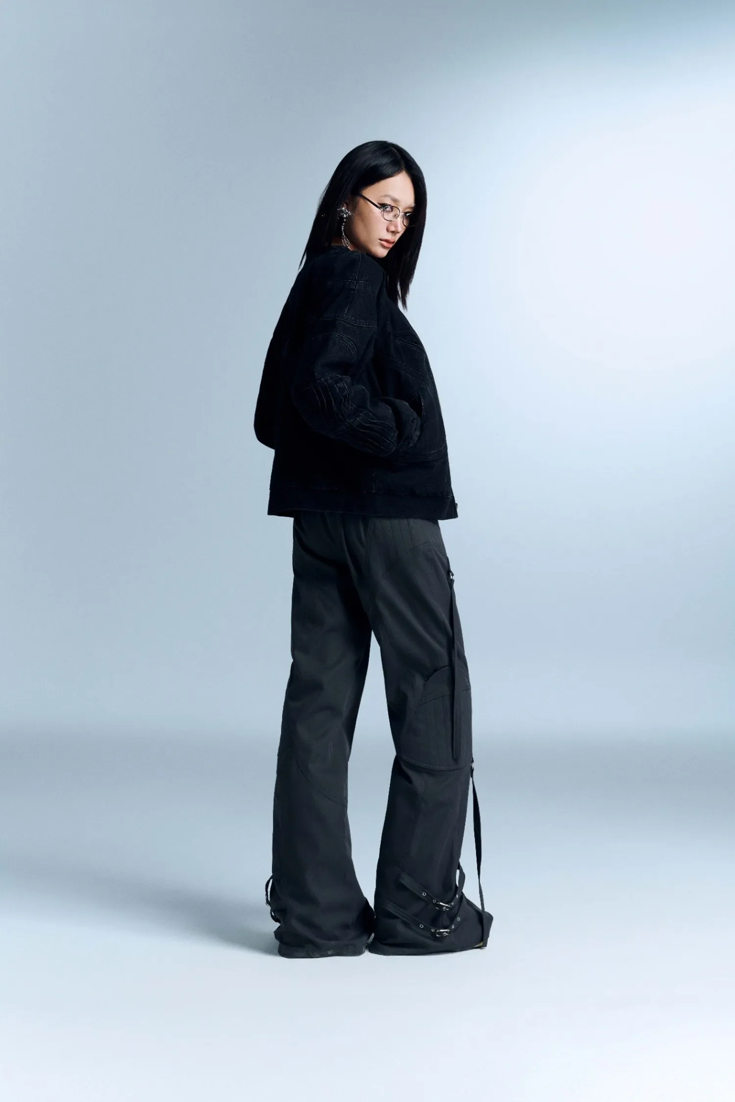水洗牛仔夾克,兩袖均有褶皺細節