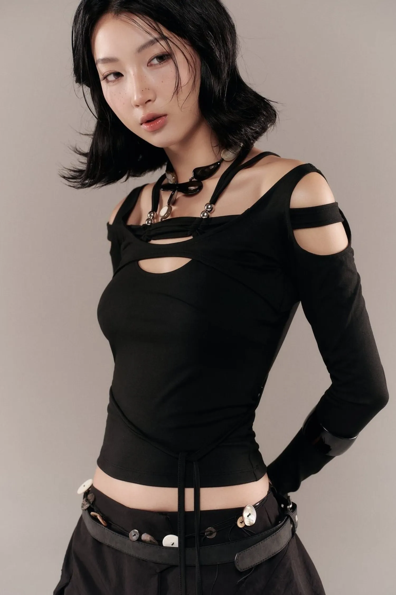 ୨୧⊹ ࣪ ˖ 商品介紹長袖上衣,肩部鏤空設計,並配有裝飾性抽繩。୨୧⊹ ࣪ ˖ 商品材質聚酯纖維/氨綸 ୨୧⊹ ࣪ ˖ 模特資訊 | Model Info 身高 171 cm / 體重 45 kg著 size 2