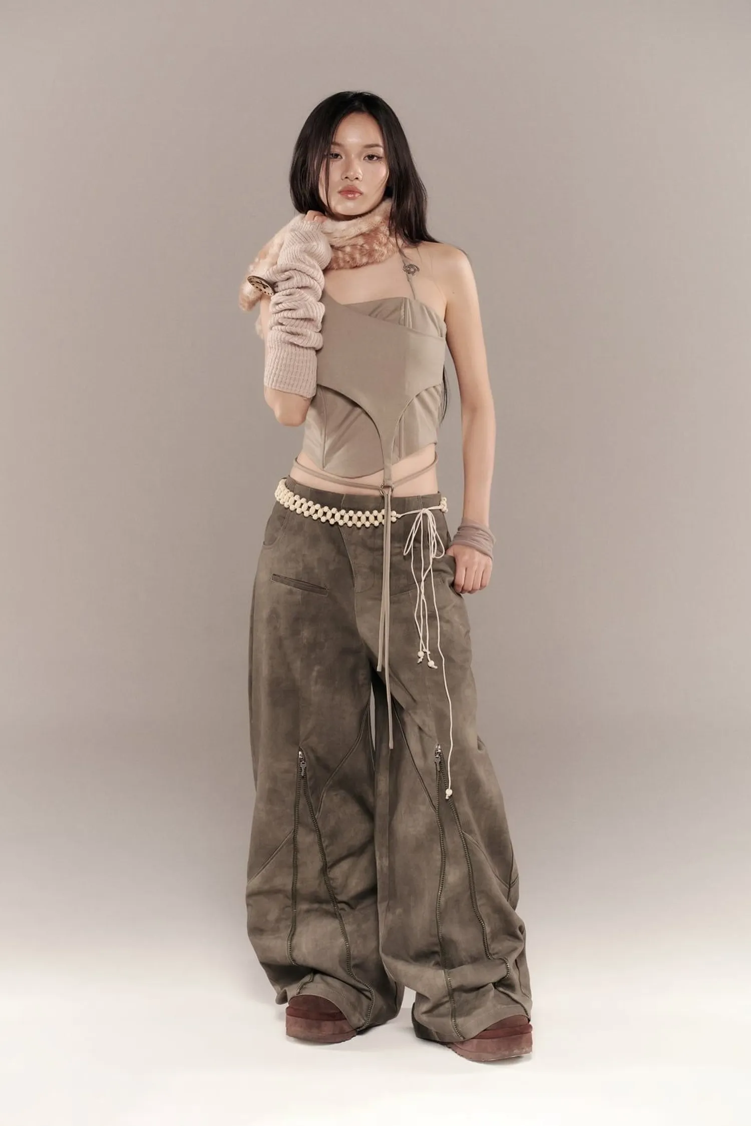 ୨୧⊹ ࣪ ˖ 商品介紹直筒褲,襠部寬鬆。前後各有兩個有蓋貼邊口袋,前後褲管均配有四條裝飾拉袢的拉鍊。飾有十顆裝飾鉚釘。୨୧⊹ ࣪ ˖ 商品材質卡其布 ୨୧⊹ ࣪ ˖ 模特資訊 | Model Info 身高 167 cm / 體重 45 kg著 size 1