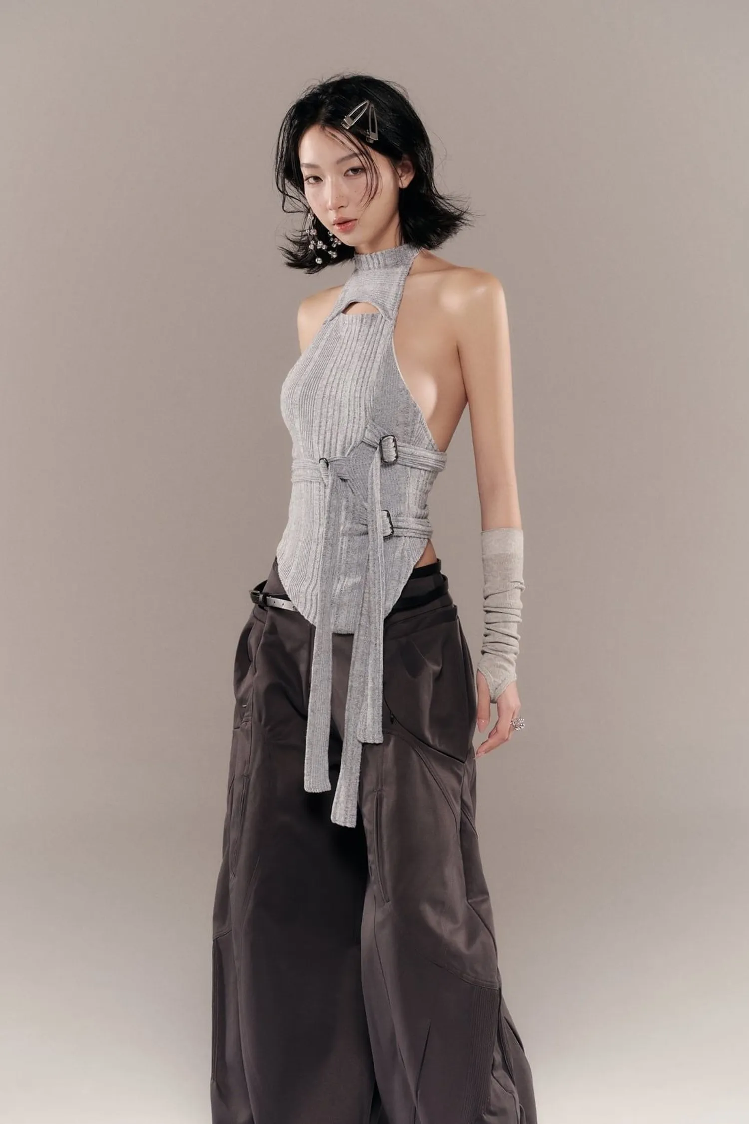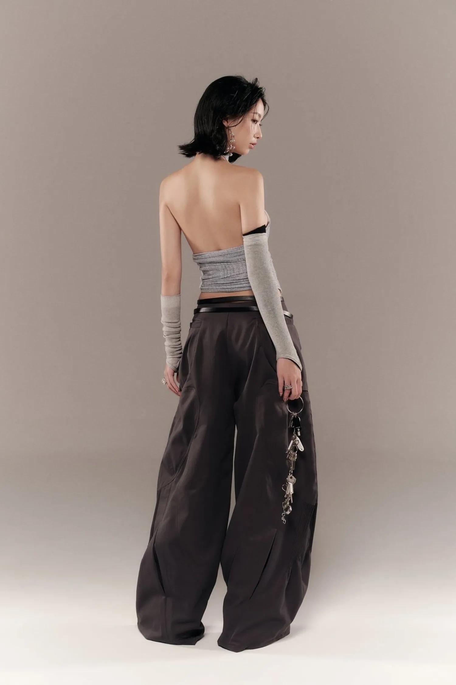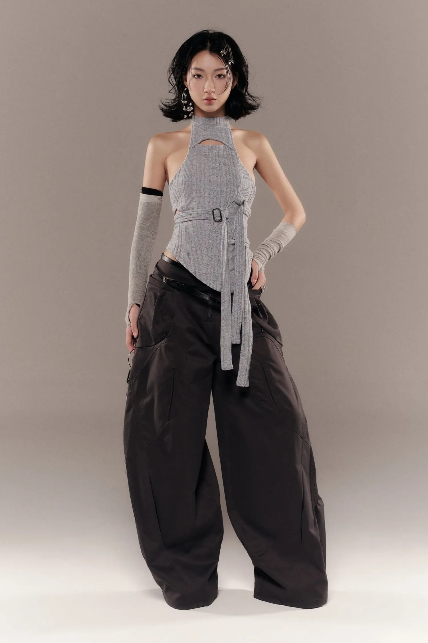 闊腿褲,口袋和褲管處有褶襉細節。