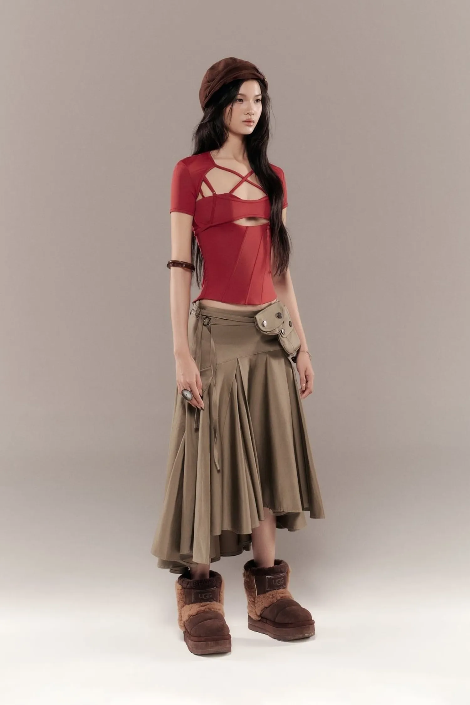 ୨୧⊹ ࣪ ˖ 商品介紹A字型百褶裙,及膝長度。配有兩條金屬扣帶和可拆卸的方形口袋。後背有兩個隱形拉鍊。୨୧⊹ ࣪ ˖ 商品材質卡其布 ୨୧⊹ ࣪ ˖ 模特資訊 | Model Info 身高 167 cm / 體重 45 kg著 size 1