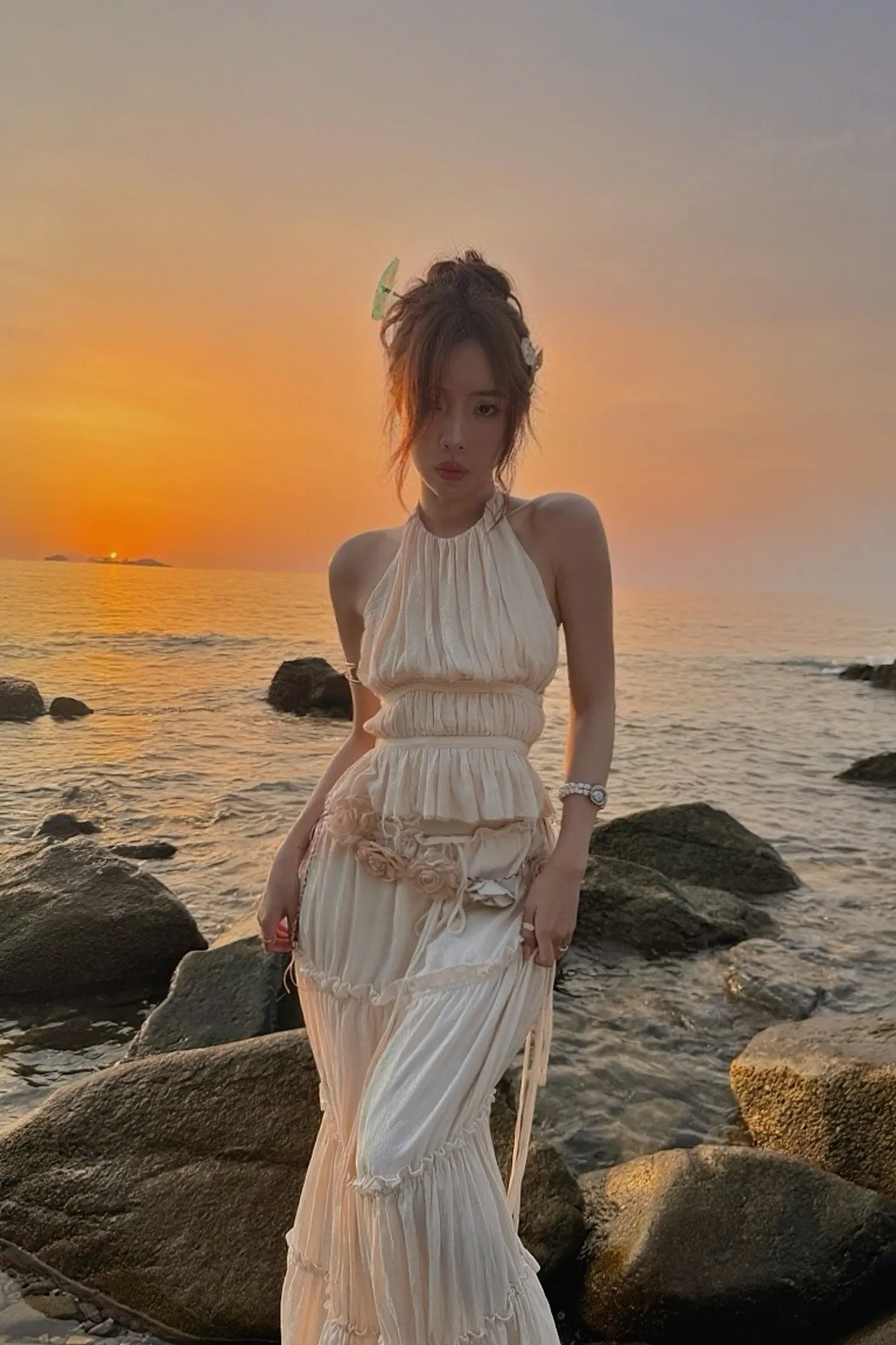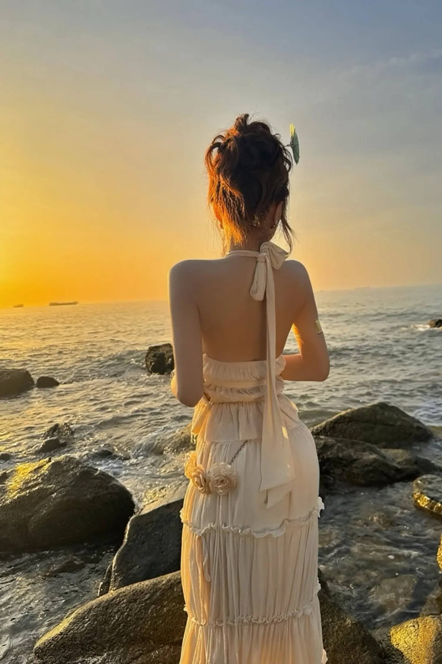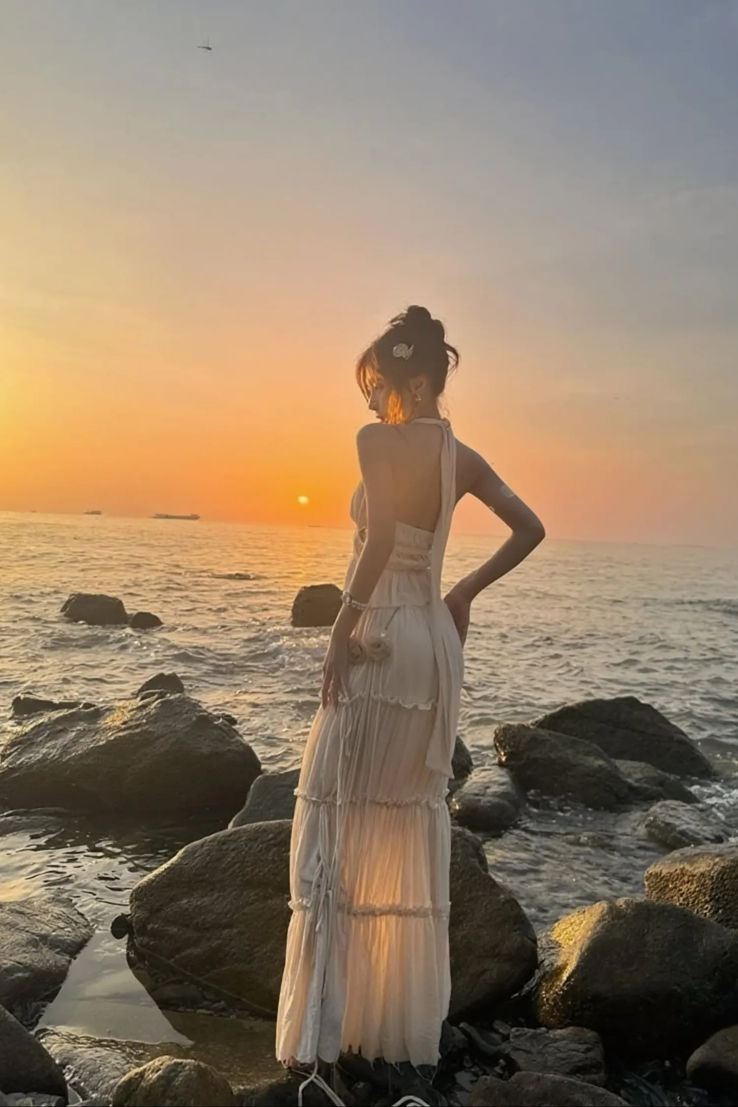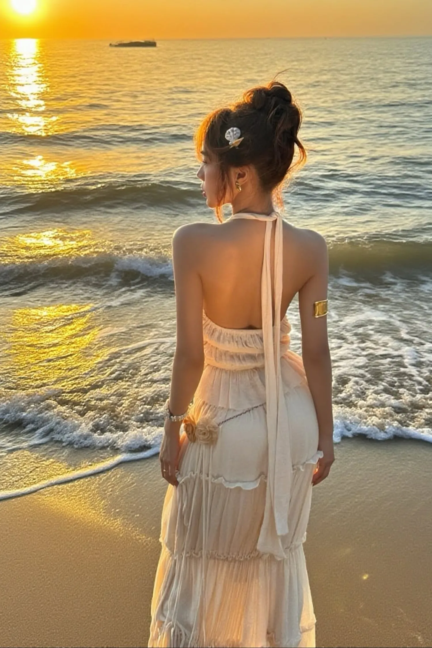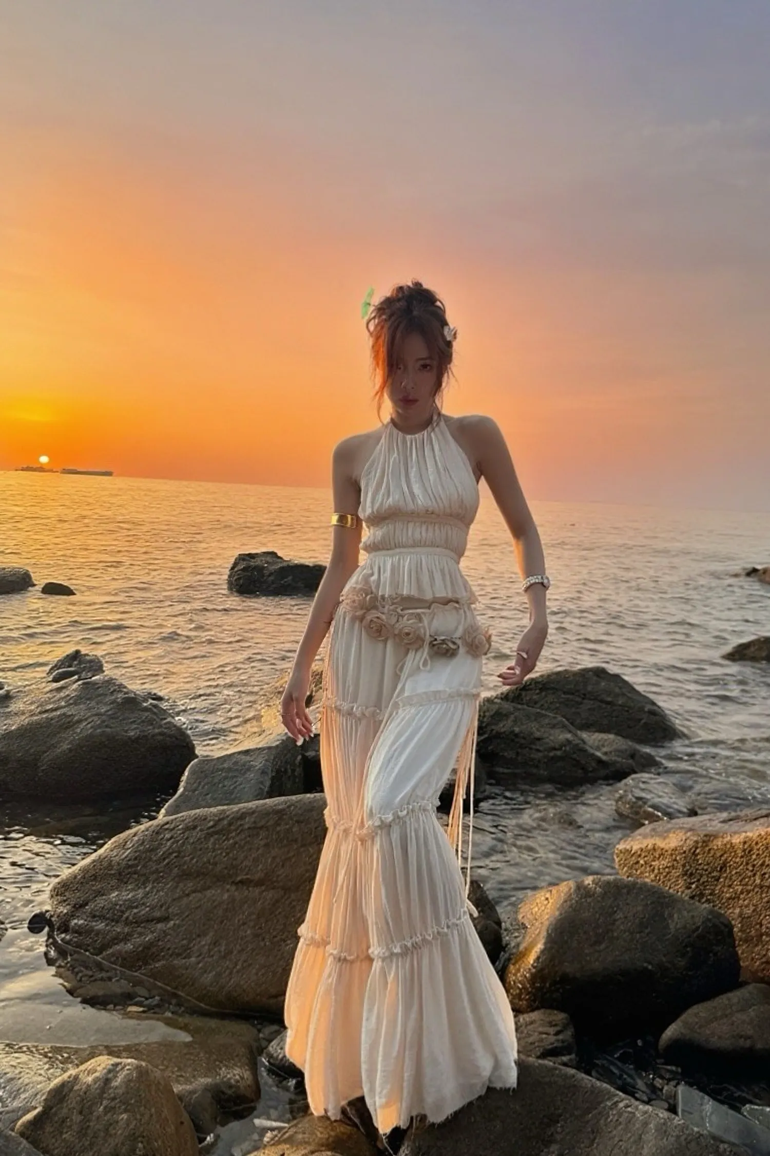 ୨୧⊹ ࣪ ˖ 商品介紹多層亞麻長裙 - 性感,背部飾邊✦材質✦優質亞麻布料,輕盈涼爽,天然柔軟,適合炎熱潮濕的天氣✦設計✦此款式略微貼身,以手工褶皺工藝將布料分成多層,營造出輕盈柔美的女性氣質露肩設計展現了肩膀線條,修飾了上半身,搭配纖細的腰身,有助於拉長身形精緻的露背設計、柔軟的蕾絲和手工製作的花卉細節,營造出性感、經典又別緻的造型 腰間繫有花朵裝飾,如同腰帶一般,打造出獨特的亮點,增添女性魅力適用場合:派對裝扮、造型圖冊拍攝、輕型活動或旅行——極其出眾且優雅