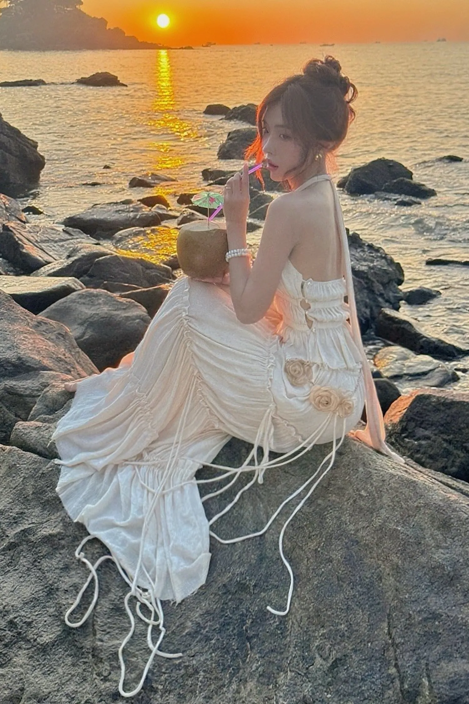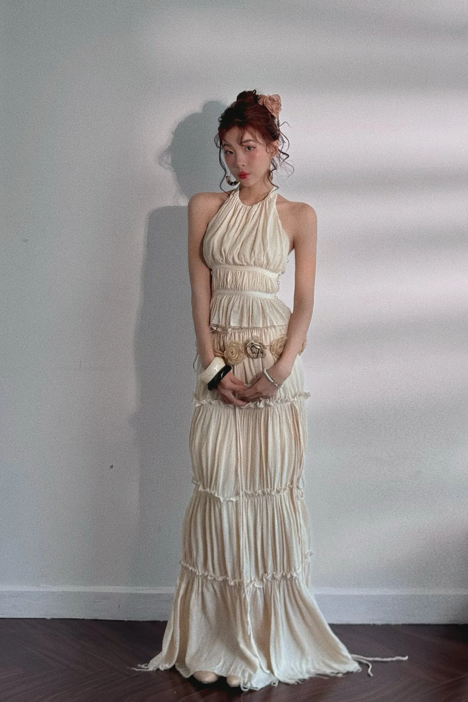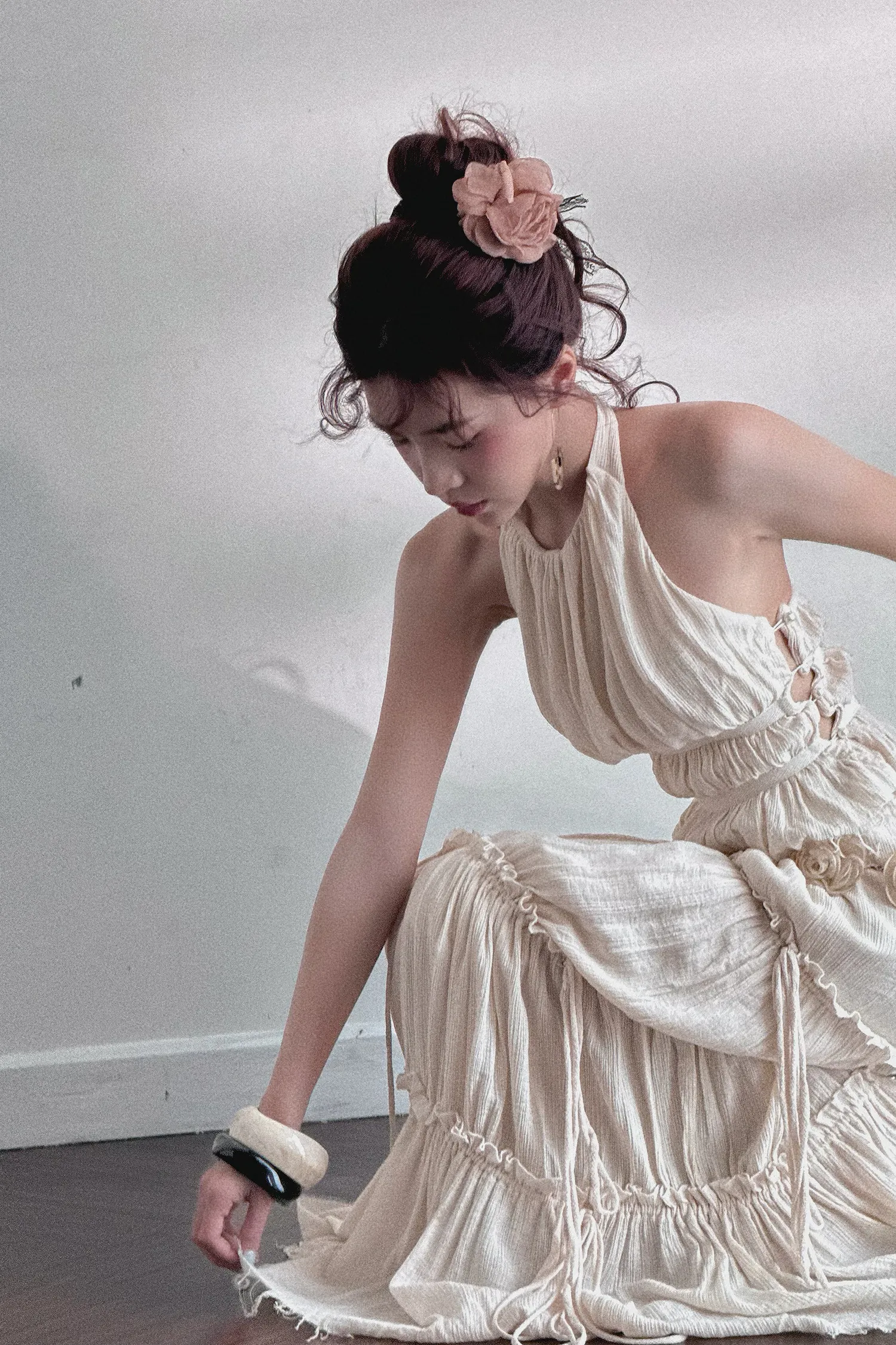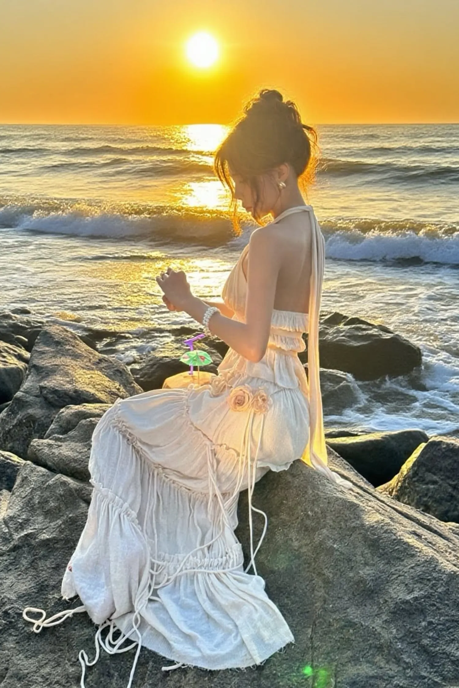 ୨୧⊹ ࣪ ˖ 商品介紹多層亞麻長裙 - 性感,背部飾邊✦材質✦優質亞麻布料,輕盈涼爽,天然柔軟,適合炎熱潮濕的天氣✦設計✦此款式略微貼身,以手工褶皺工藝將布料分成多層,營造出輕盈柔美的女性氣質露肩設計展現了肩膀線條,修飾了上半身,搭配纖細的腰身,有助於拉長身形精緻的露背設計、柔軟的蕾絲和手工製作的花卉細節,營造出性感、經典又別緻的造型 腰間繫有花朵裝飾,如同腰帶一般,打造出獨特的亮點,增添女性魅力適用場合:派對裝扮、造型圖冊拍攝、輕型活動或旅行——極其出眾且優雅