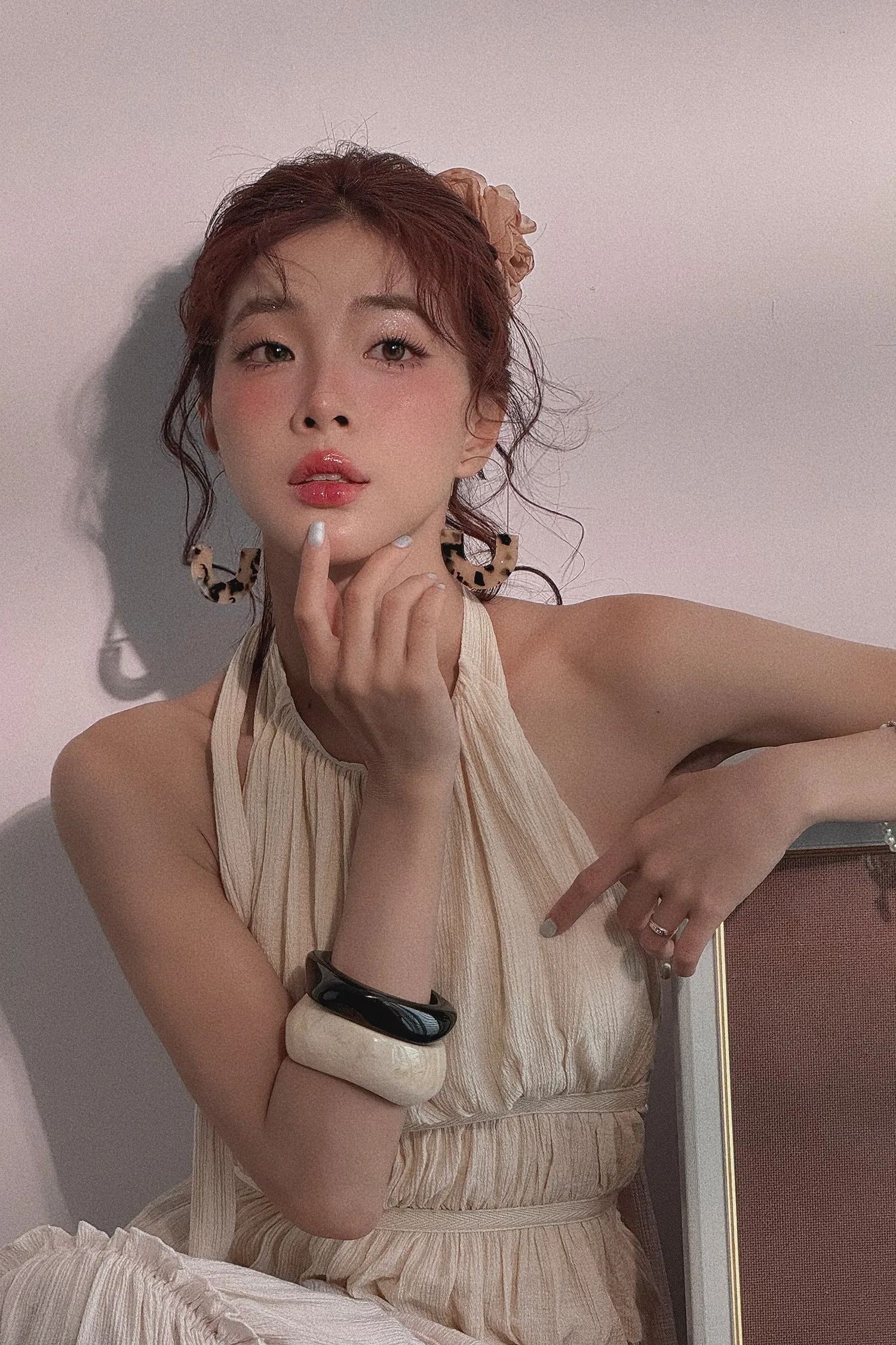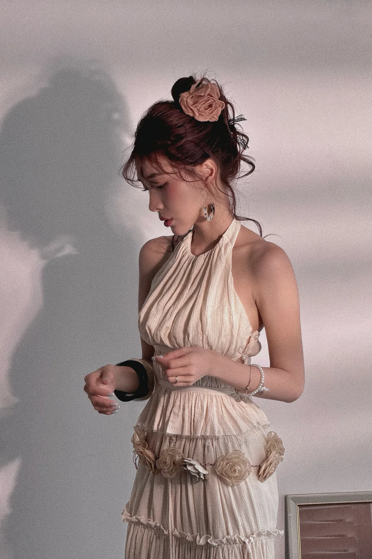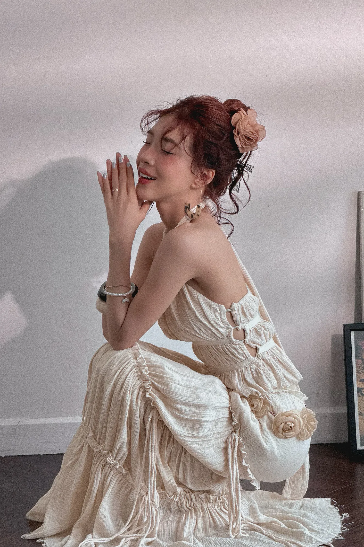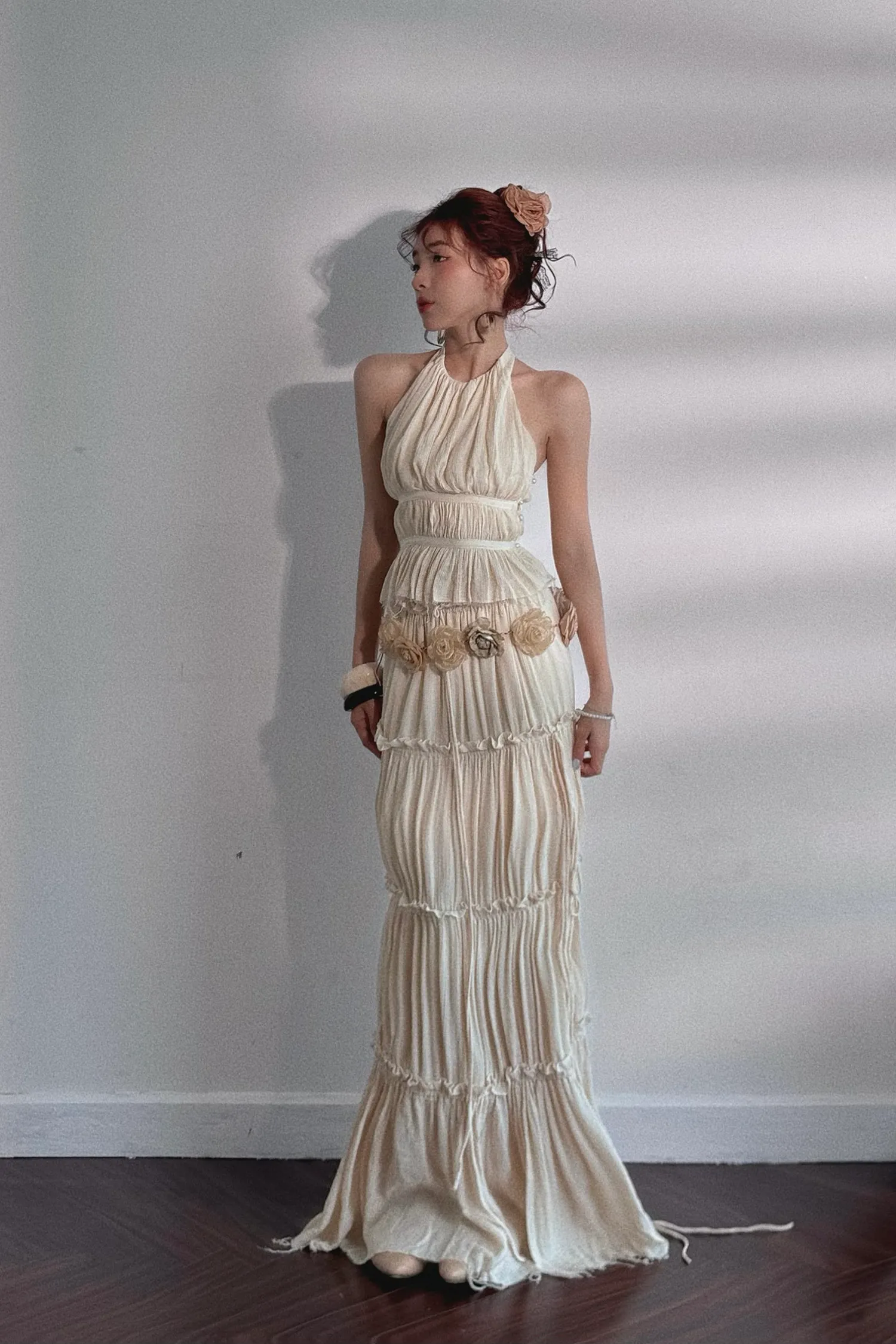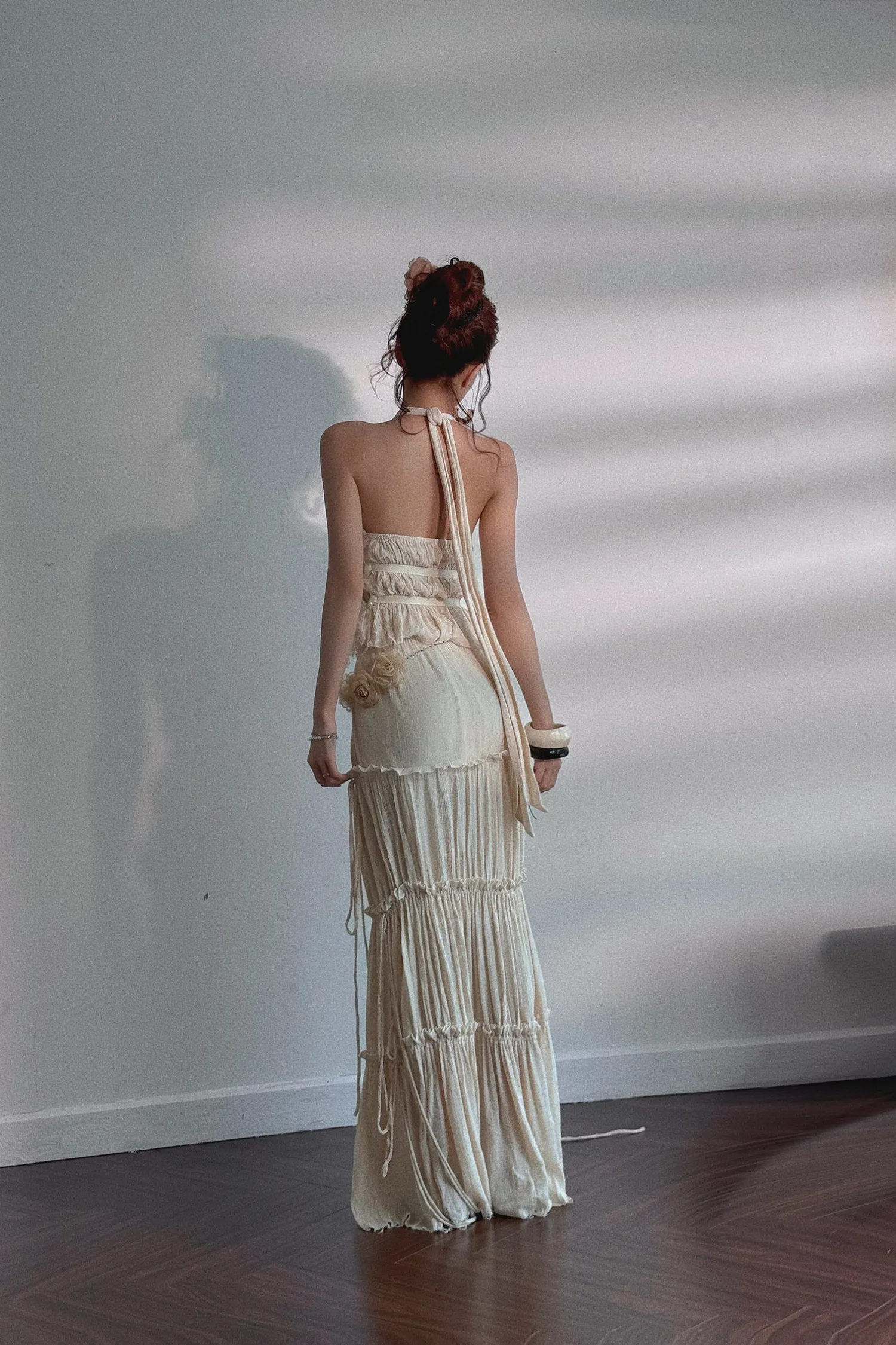 ୨୧⊹ ࣪ ˖ 商品介紹多層亞麻長裙 - 性感,背部飾邊✦材質✦優質亞麻布料,輕盈涼爽,天然柔軟,適合炎熱潮濕的天氣✦設計✦此款式略微貼身,以手工褶皺工藝將布料分成多層,營造出輕盈柔美的女性氣質露肩設計展現了肩膀線條,修飾了上半身,搭配纖細的腰身,有助於拉長身形精緻的露背設計、柔軟的蕾絲和手工製作的花卉細節,營造出性感、經典又別緻的造型 腰間繫有花朵裝飾,如同腰帶一般,打造出獨特的亮點,增添女性魅力適用場合:派對裝扮、造型圖冊拍攝、輕型活動或旅行——極其出眾且優雅