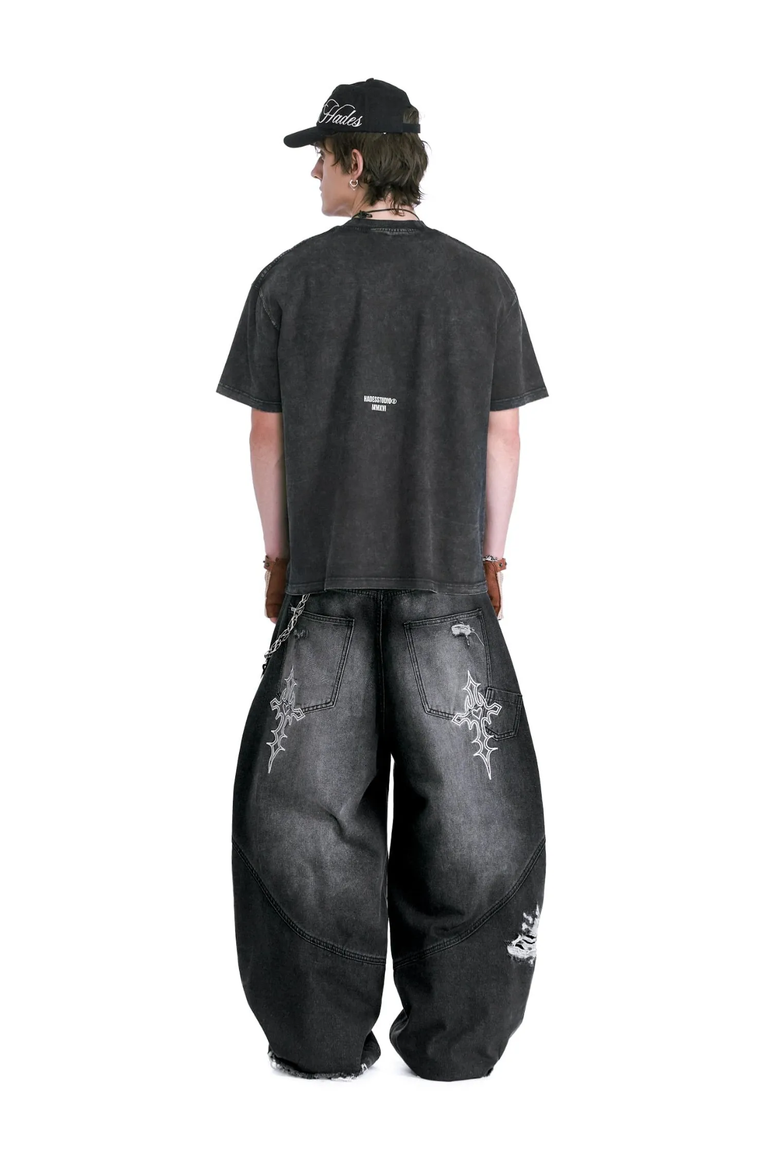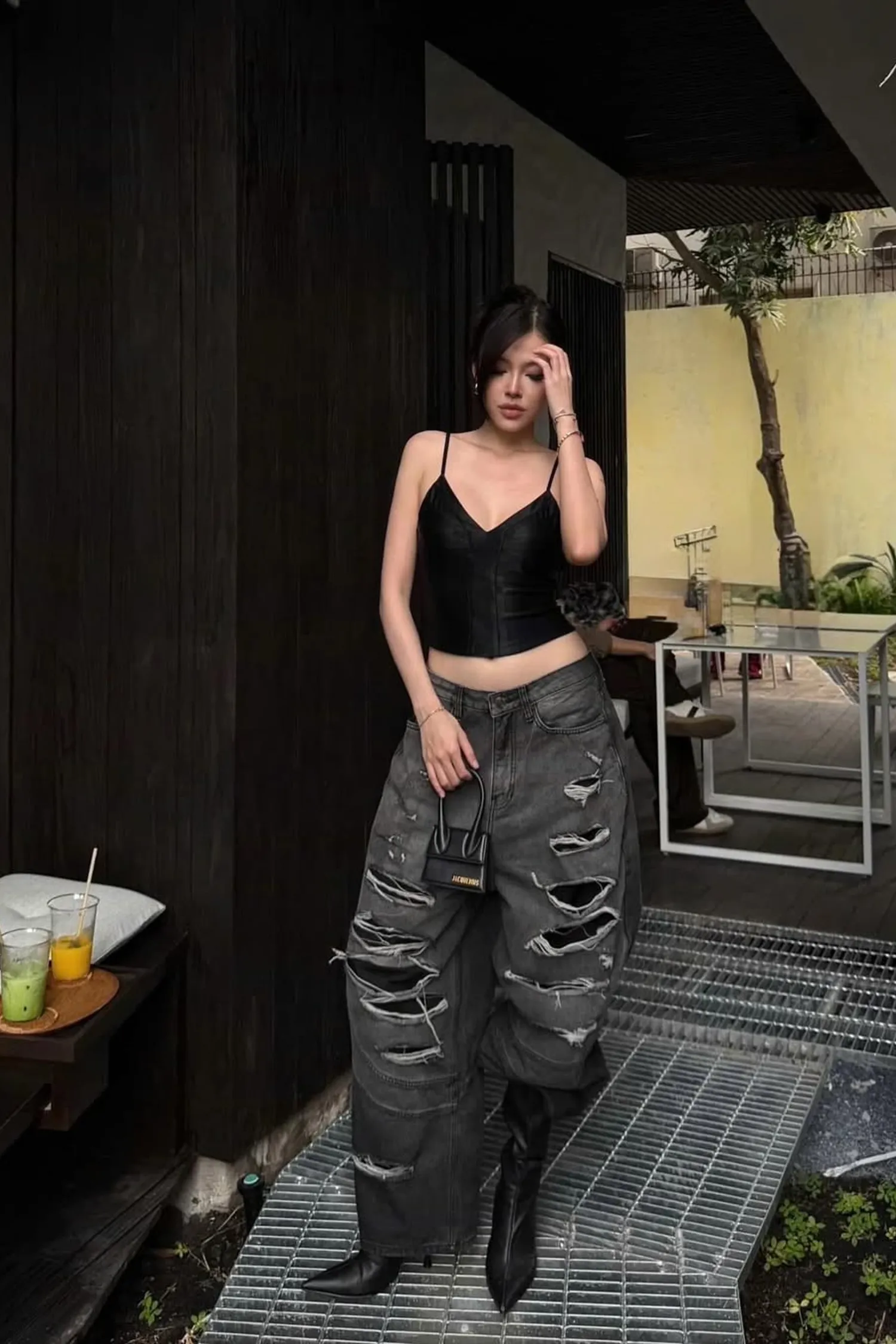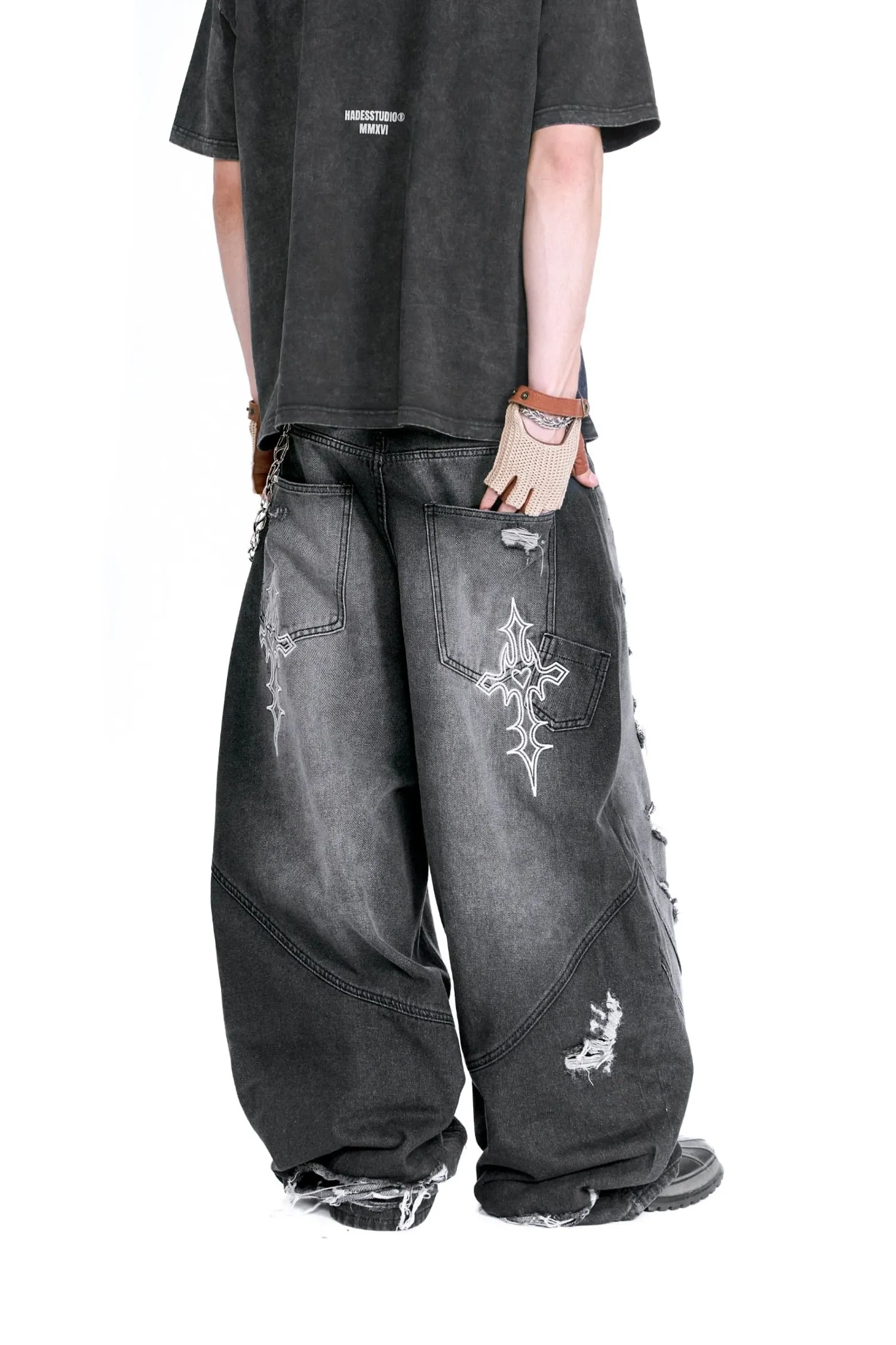 • 寬腿直筒水洗牛仔褲,褲管能蓋住鞋子。