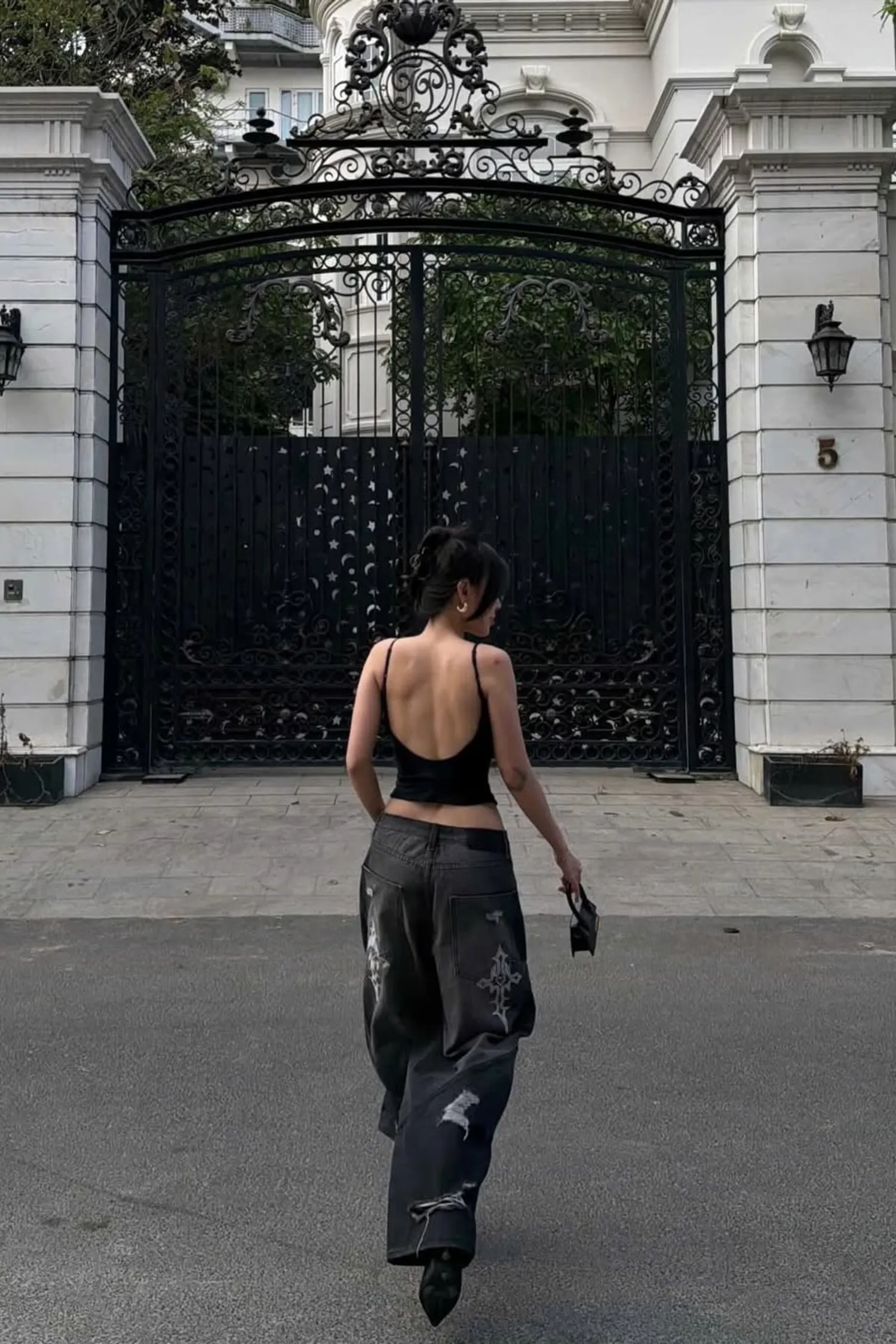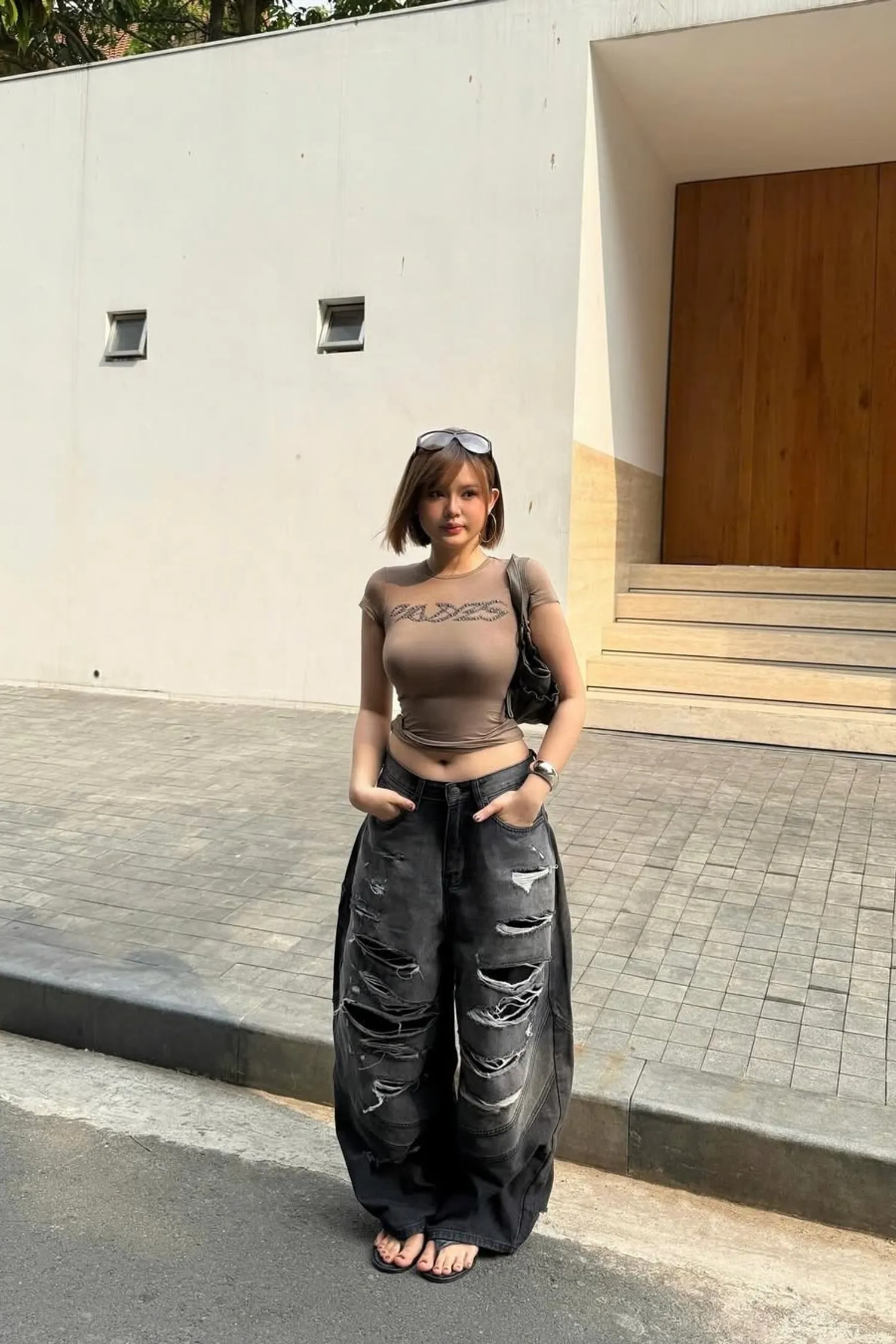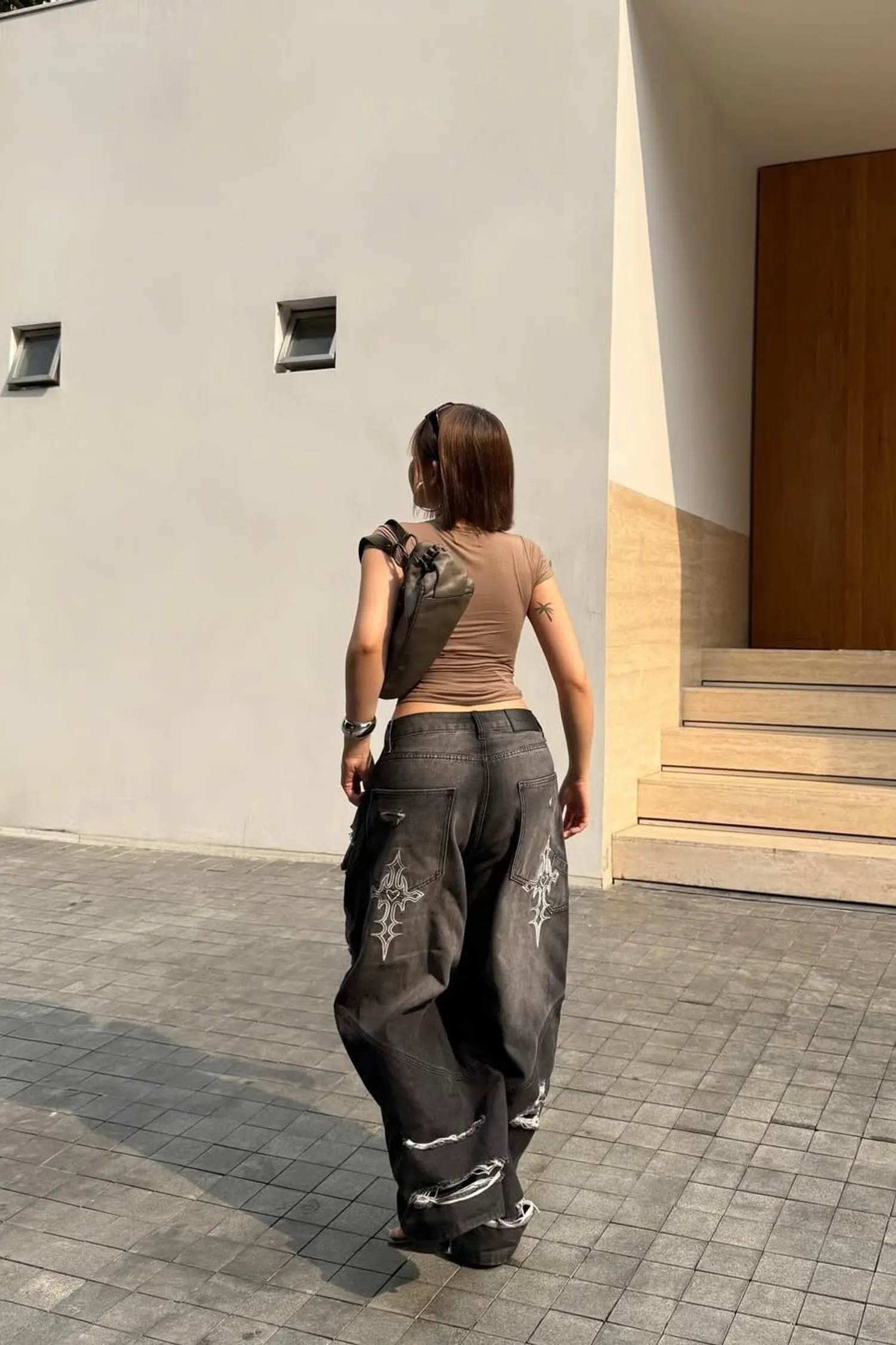 • 寬腿直筒水洗牛仔褲,褲管能蓋住鞋子。