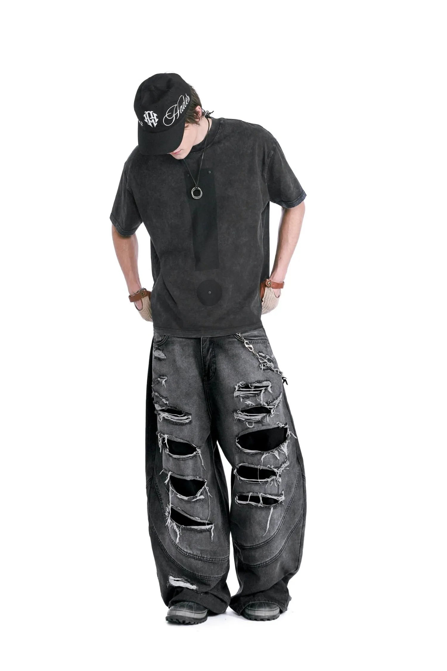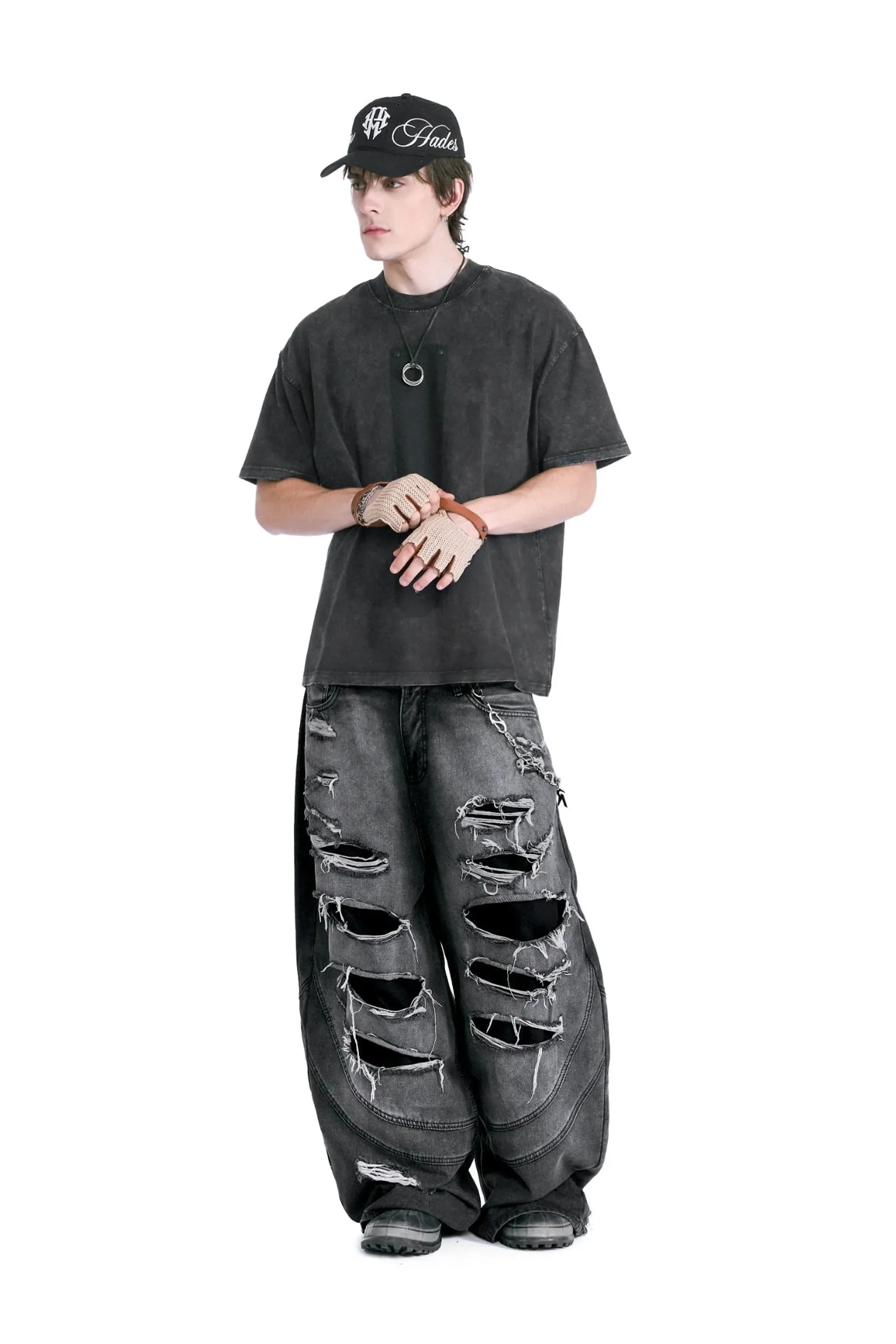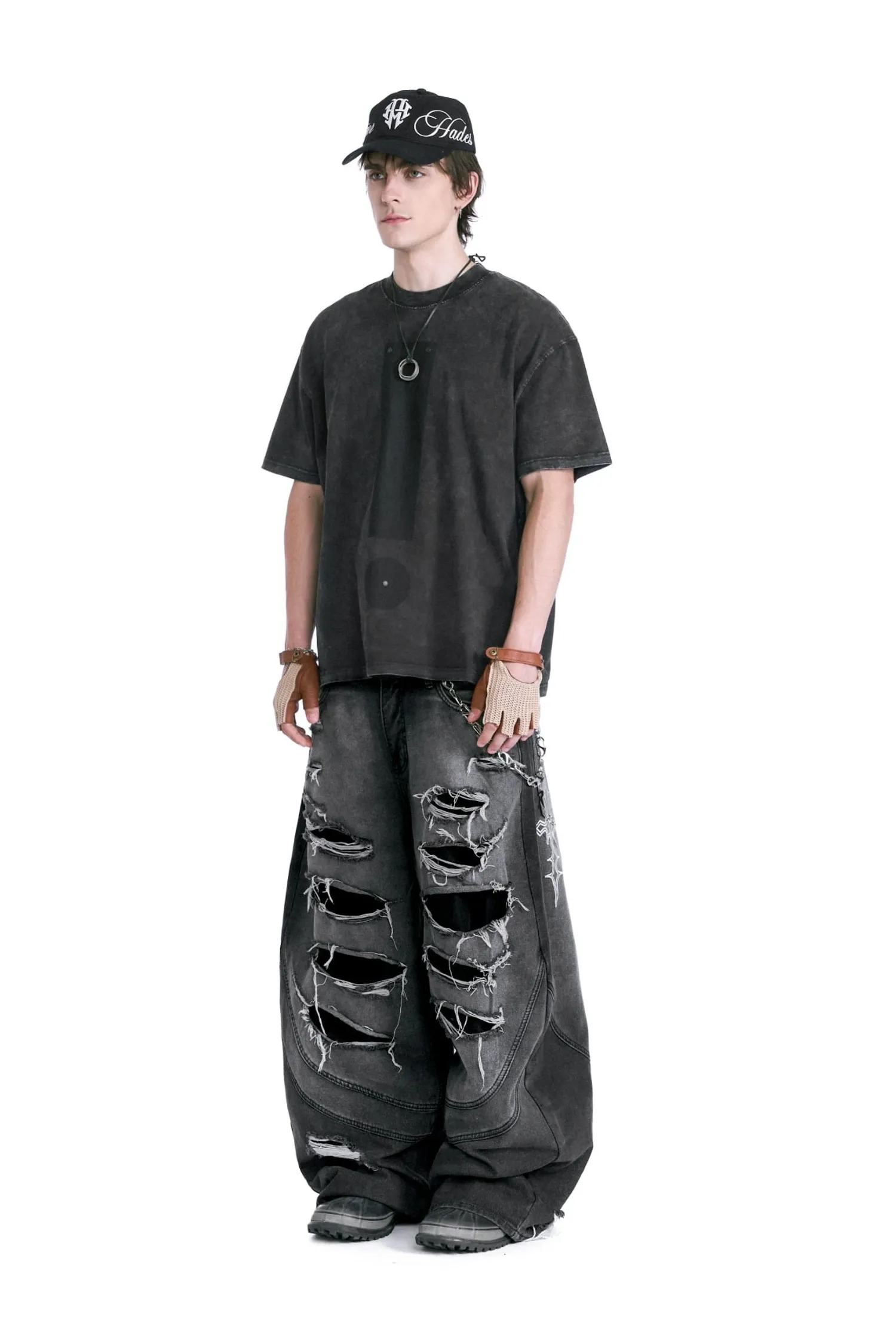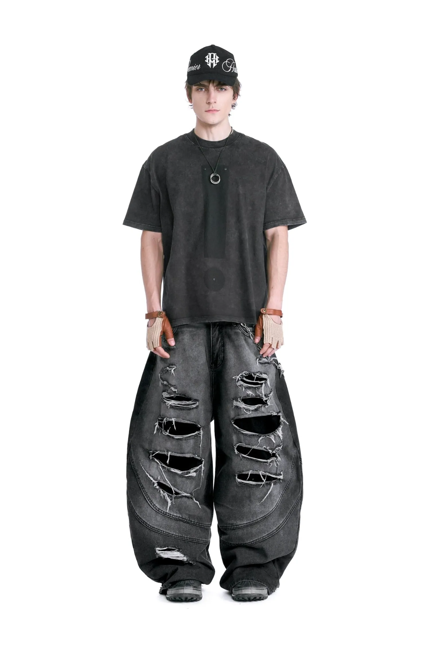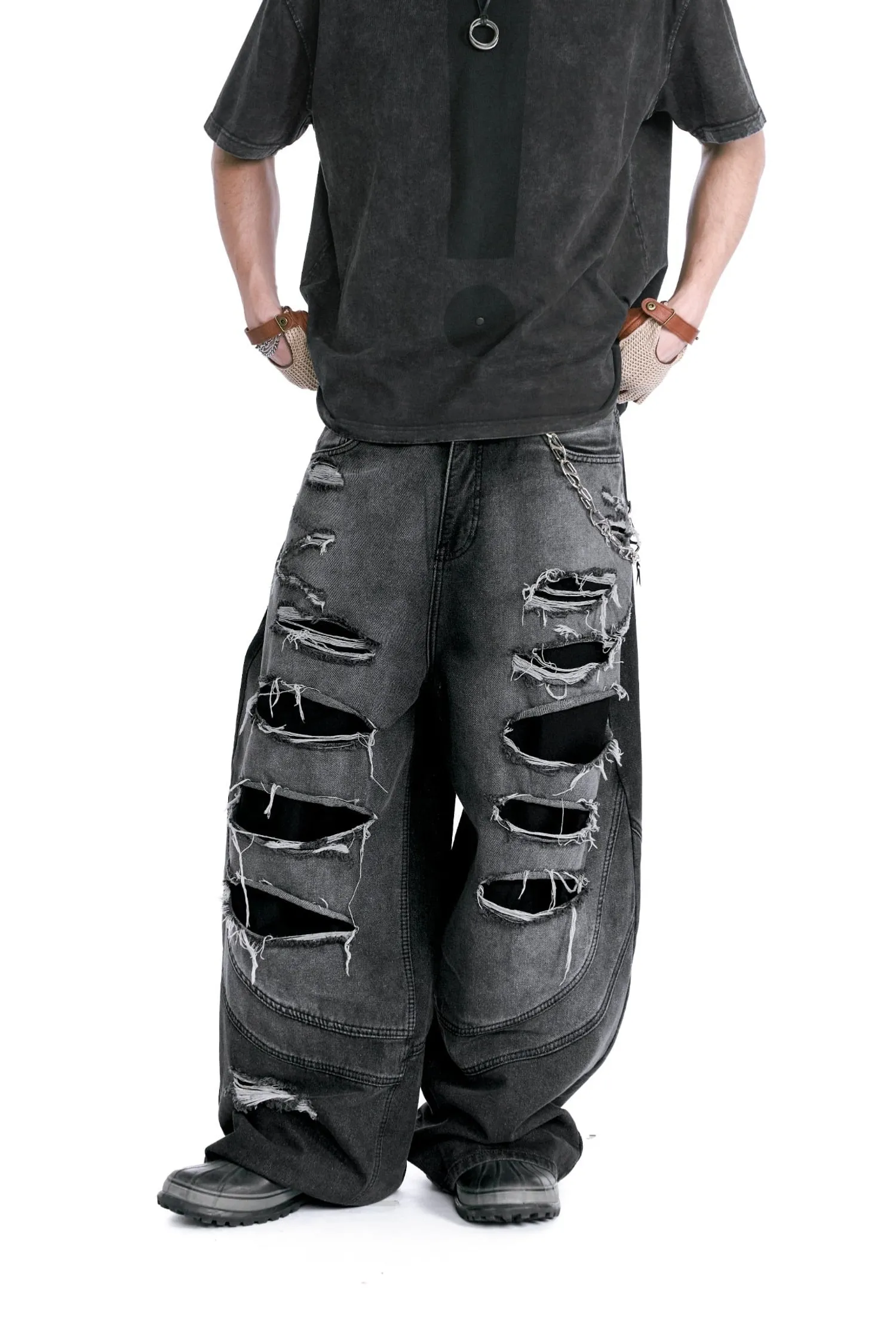 • 該設計以大面積撕裂部分和粗糙的磨損表面為特色。