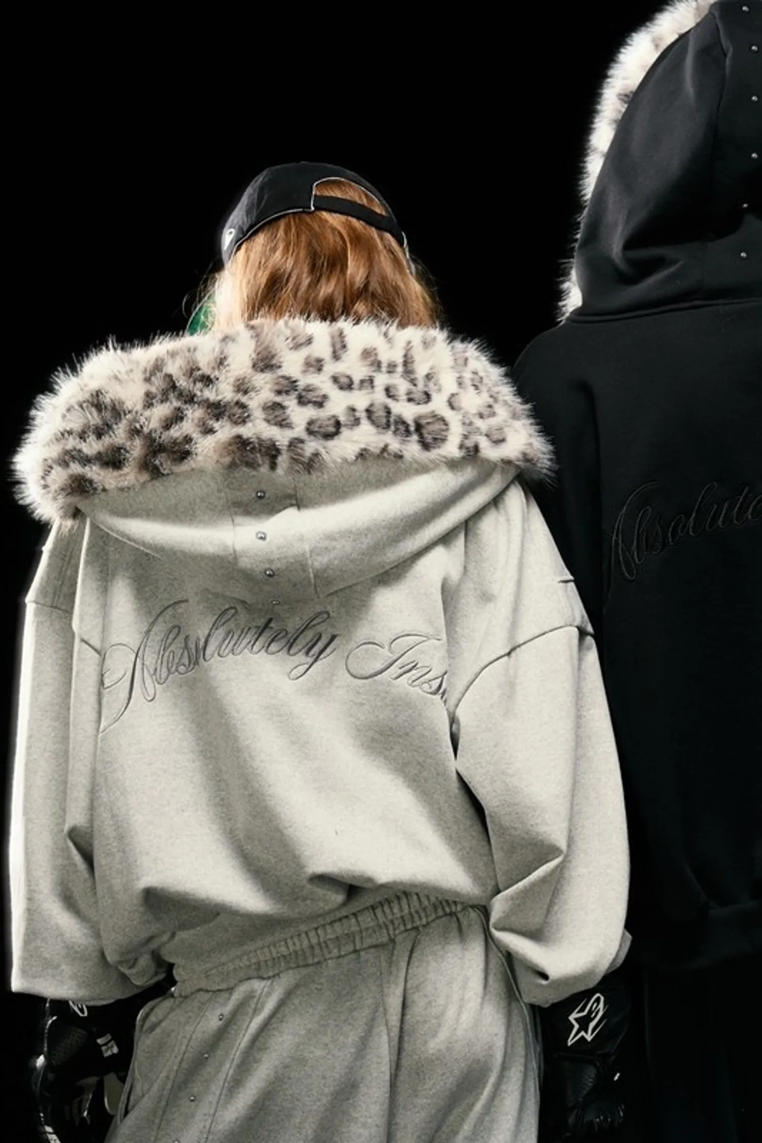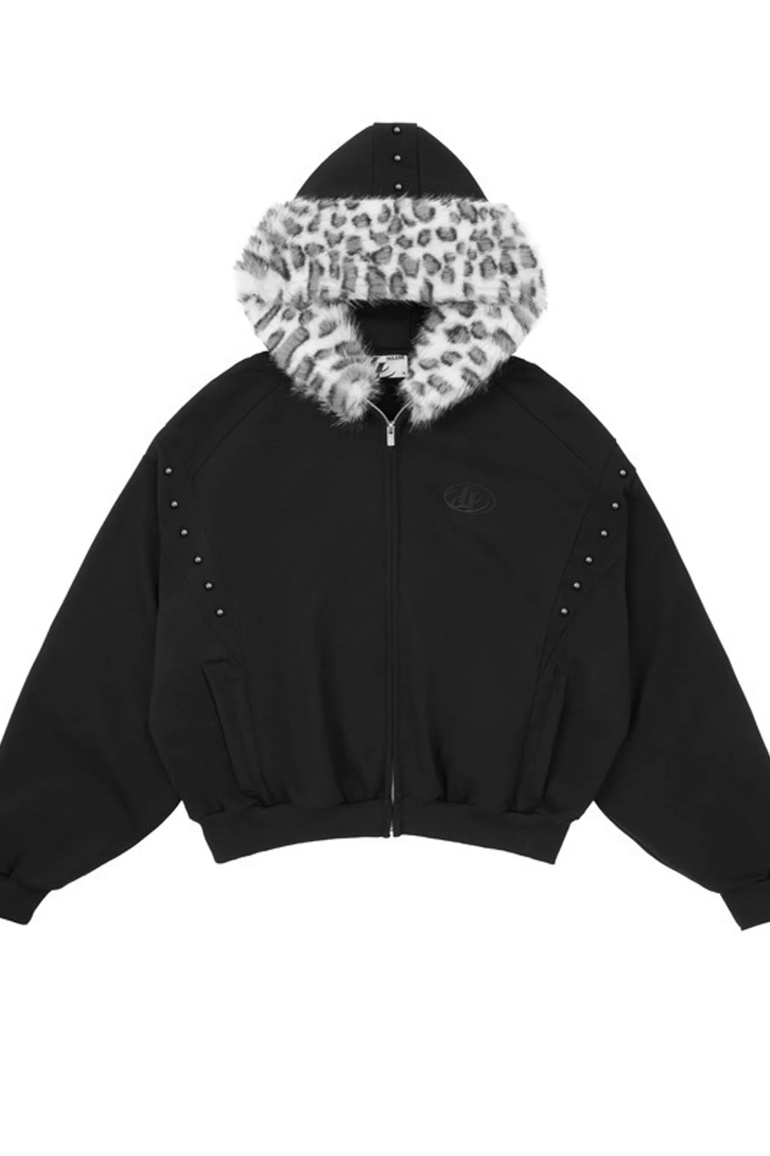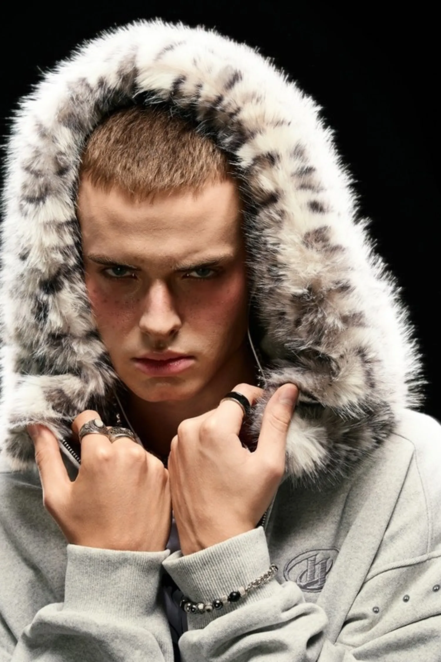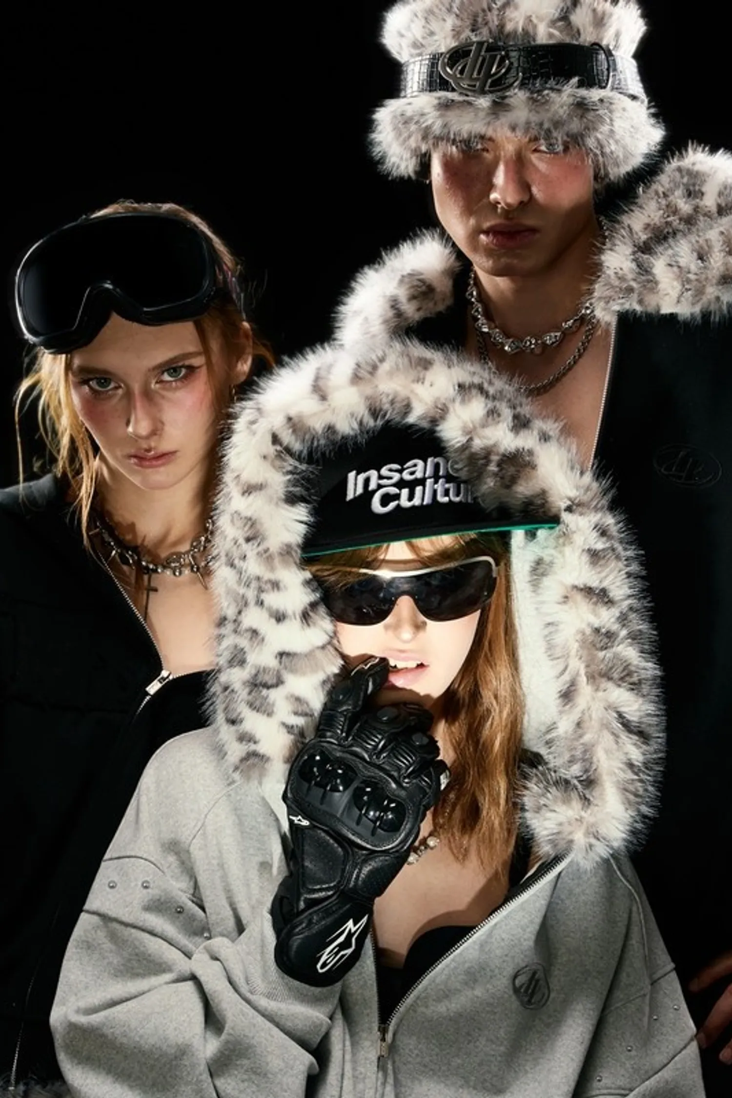 :厚實刺繡 + 金屬鉚釘 + 仿獸紋毛面料結合,呈現粗獷街頭質感